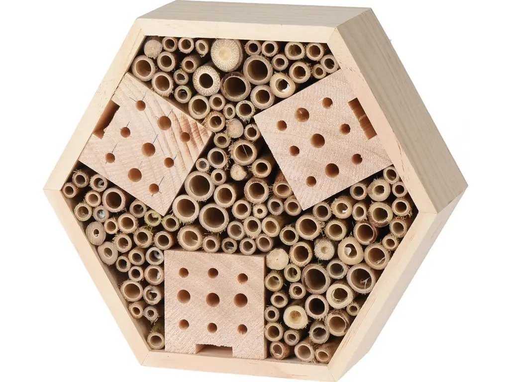 Hmyzí hotel ve tvaru hexagonu zavěsíte na strom nebo za okap pomocí háku. Vytvoříte uměle vytvořenou skrýš pro prospěšný hmyz. Využijí ji jako úkryt či jako prostor ke kladení vajíček a následný vývoj larev. Ukažte svým dětem hmyzí budku a uplatněte ji jako vzdělávací pomůcku. Naučte je rozpoznávat brouky podle vzhledu, seznamte je s jejich jmény a vysvětlete jim, v čem jsou užiteční.