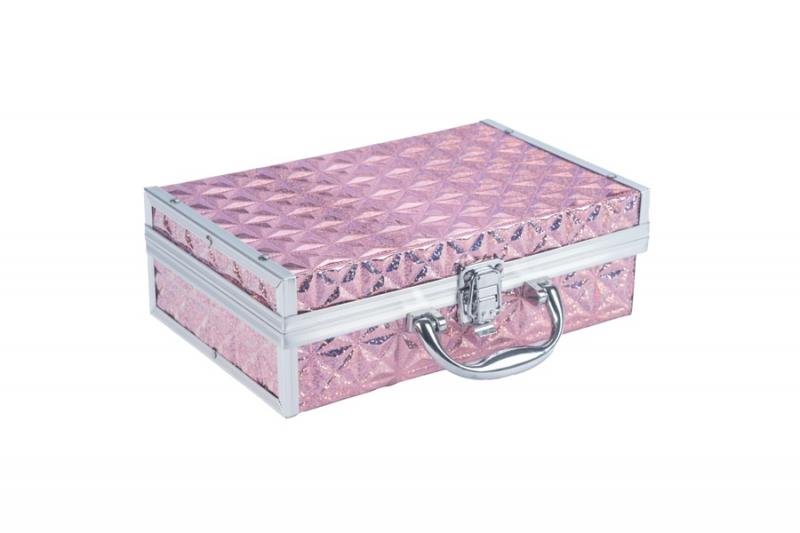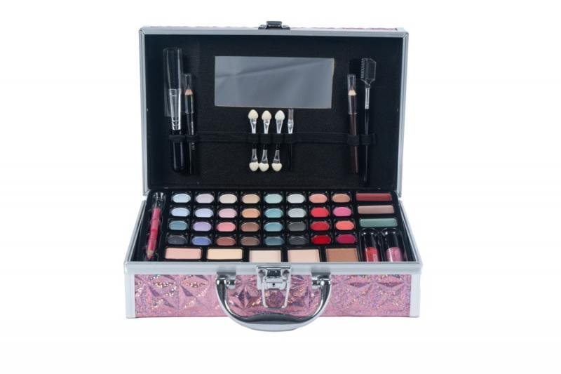Máte doma malou parádnici? Potěšte ji krásným kosmetickým kufříkem v růžové barvě. Uvnitř najde 24 různě barevných očních stínů, 8 třpytek na rty, 4 tvářenky, 3 obličejové pudry, 2 lesky na rty, 3 krémové oční stíny, dvojitou tužku, 2 tužky na oči, štětec na obočí, 3 dvojité aplikátory, štětec na rty, štětec na tvářenku a zrcátko. S touto obsáhlou sadou líčidel zažije spoustu zábavy. Kufřík je ideální dárek pro děti od 12 let.