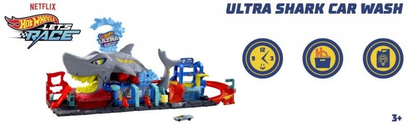 Zabavte děti autodráhou City Color Reveal – Automyčka se žralokem značky Hot Wheels. Městskou automyčku osadil obrovský žralok. S autíčky můžete po rampě vjet přímo do jeho tlamy. Jakmile pak stisknete hlavu žraloka, změní se barva vody a odhalí novou barvu karoserie. Vytáhněte žraloka nahoru a sledujte, jak se autíčka řítí jeho útrobami. Poklepáním na ocasní ploutev vypustíte auta do nádrže s ledovou vodou. Okamžitě při ponoření změní barvu. Pokud je pak vložíte do nádrže s teplou vodou, barva se změní nazpět. Součástí balení je jedno autíčko Color Reveal.
