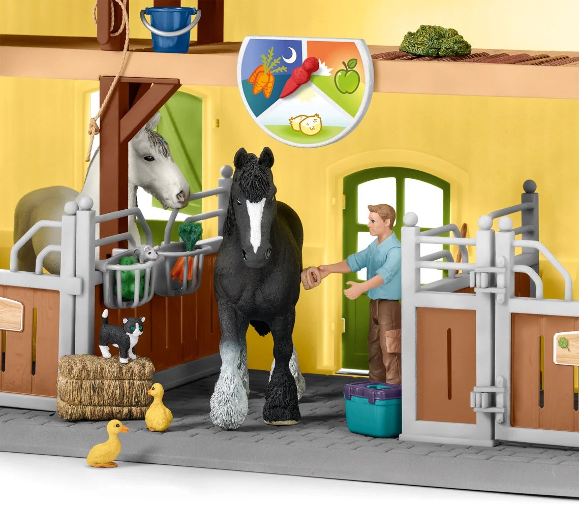 Patří vaše dítě mezi milovníky zvířat a rádo se o ně stará? Model Stáj pro koně s příslušenstvím od značky Schleich mu jistě udělá radost. V balení najde figurky farmářů Paula a Laury, klisny, hřebce, 3 kachňátek, kotěte a myši. Vymyslí si pro ně spoustu zajímavých příběhů. K figurkám váš potomek dostane velké množství dalšího příslušenství, například skluzavku, houpačku, krmení nebo žlab. Postavičky farmářů mají pohyblivé ruce.