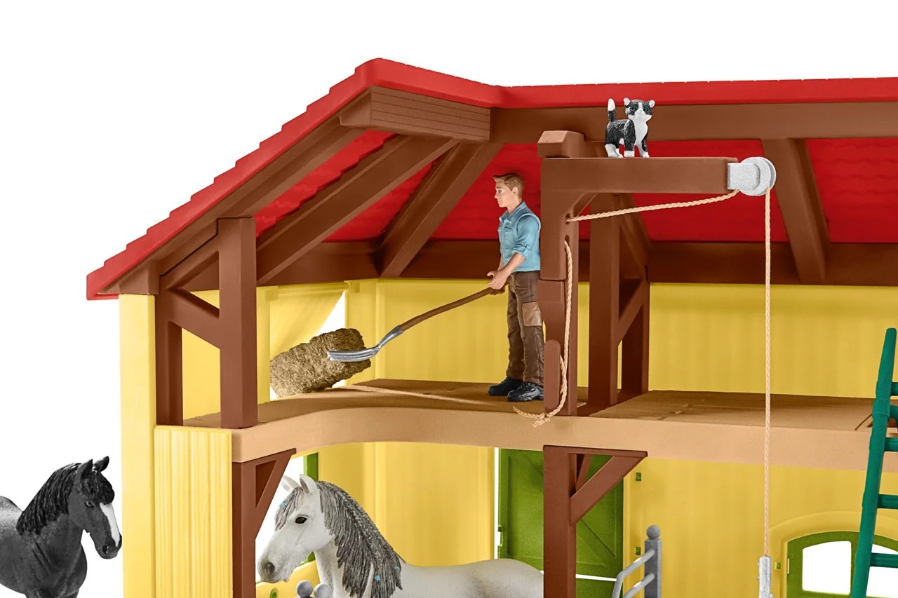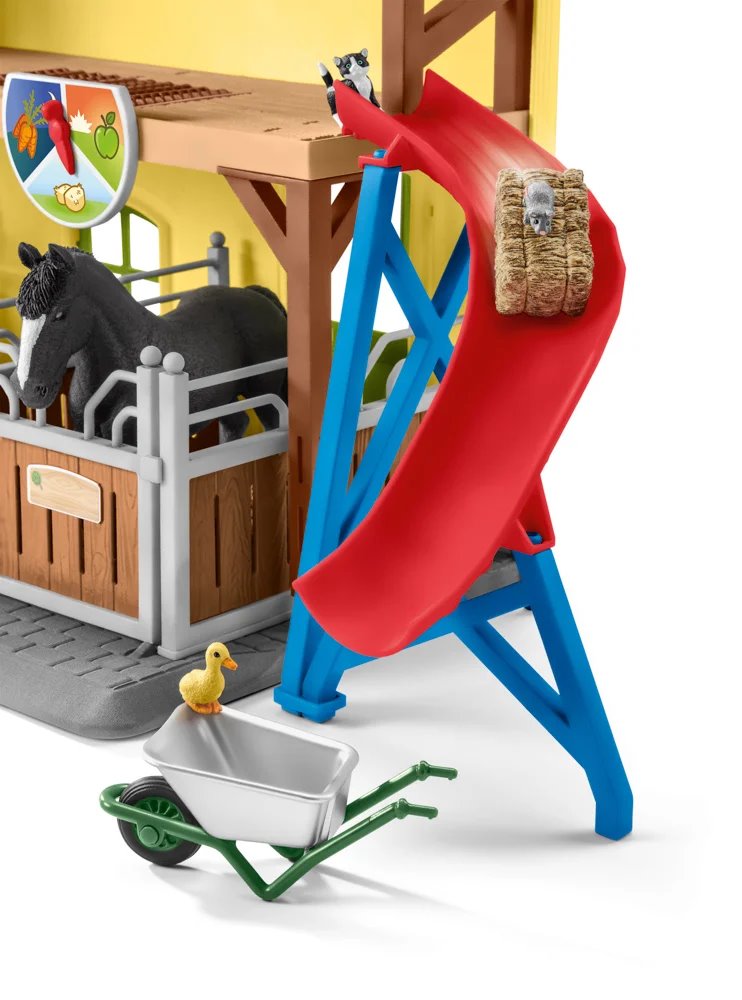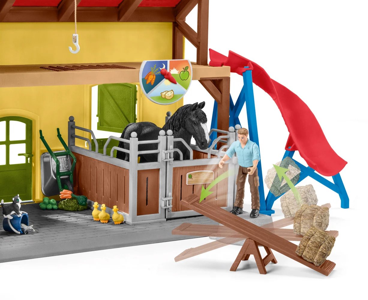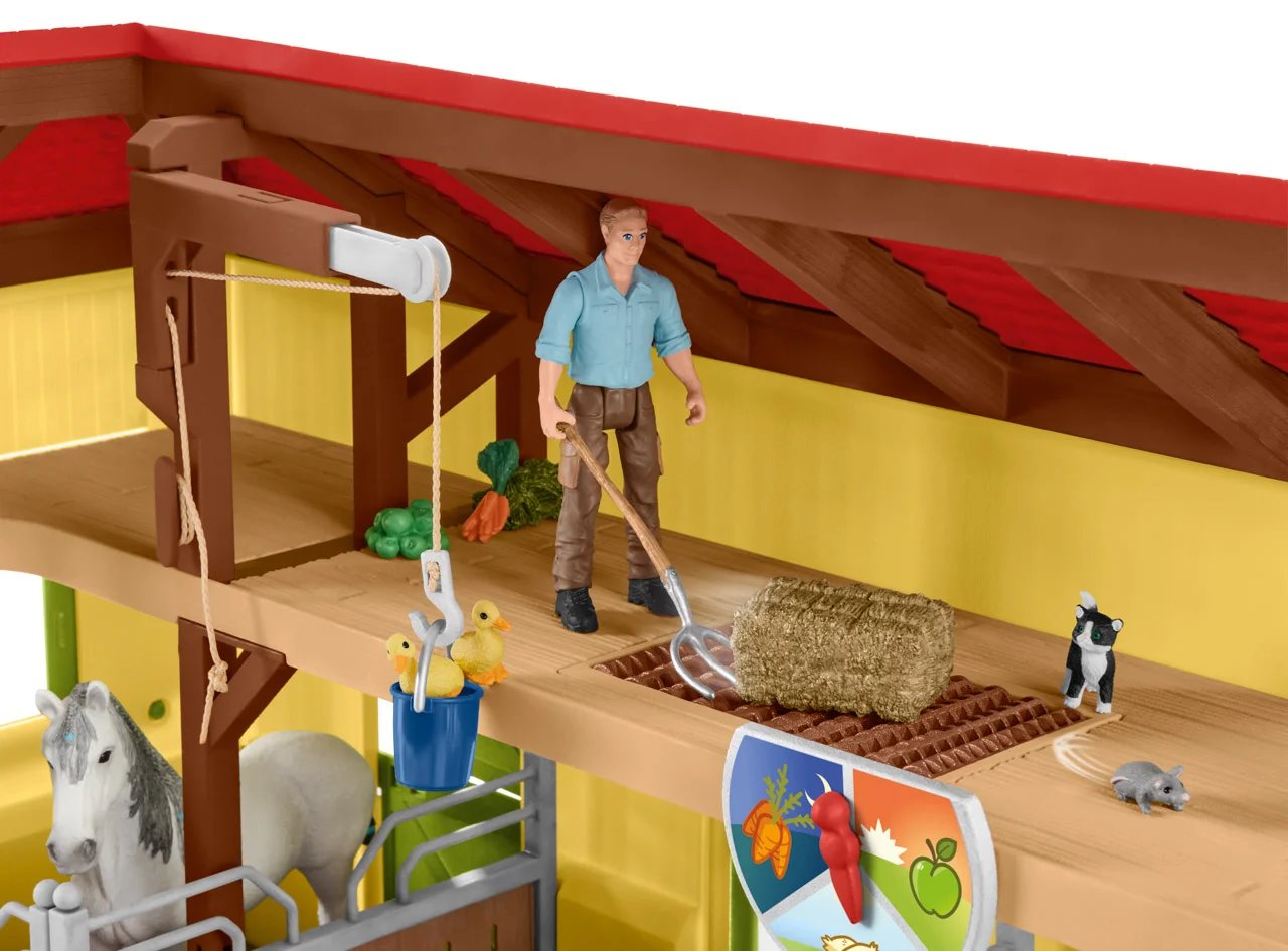 Figurky jsou krásně malované a detailní. Dítě si s hračkou vyhraje a užije si mnoho zábavy. S farmářkou se projede na koni, s farmářem zase nakrmí zvířata. Seno do seníku uloží díky šikovnému kladkostroji nebo houpačce a dolů ho dopraví po klouzačce. V balení navíc najde samolepky, kterými si stáj může ozdobit.