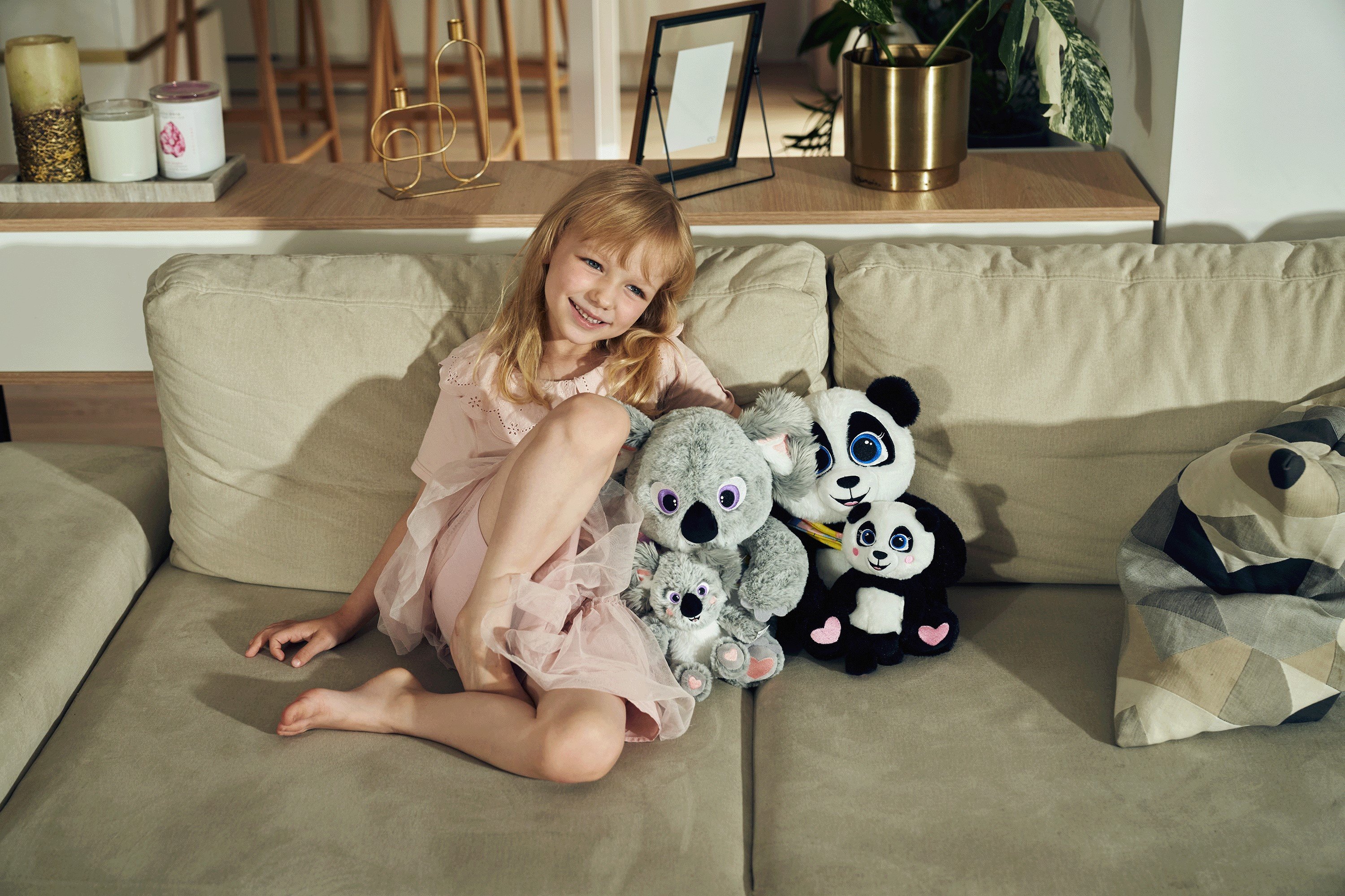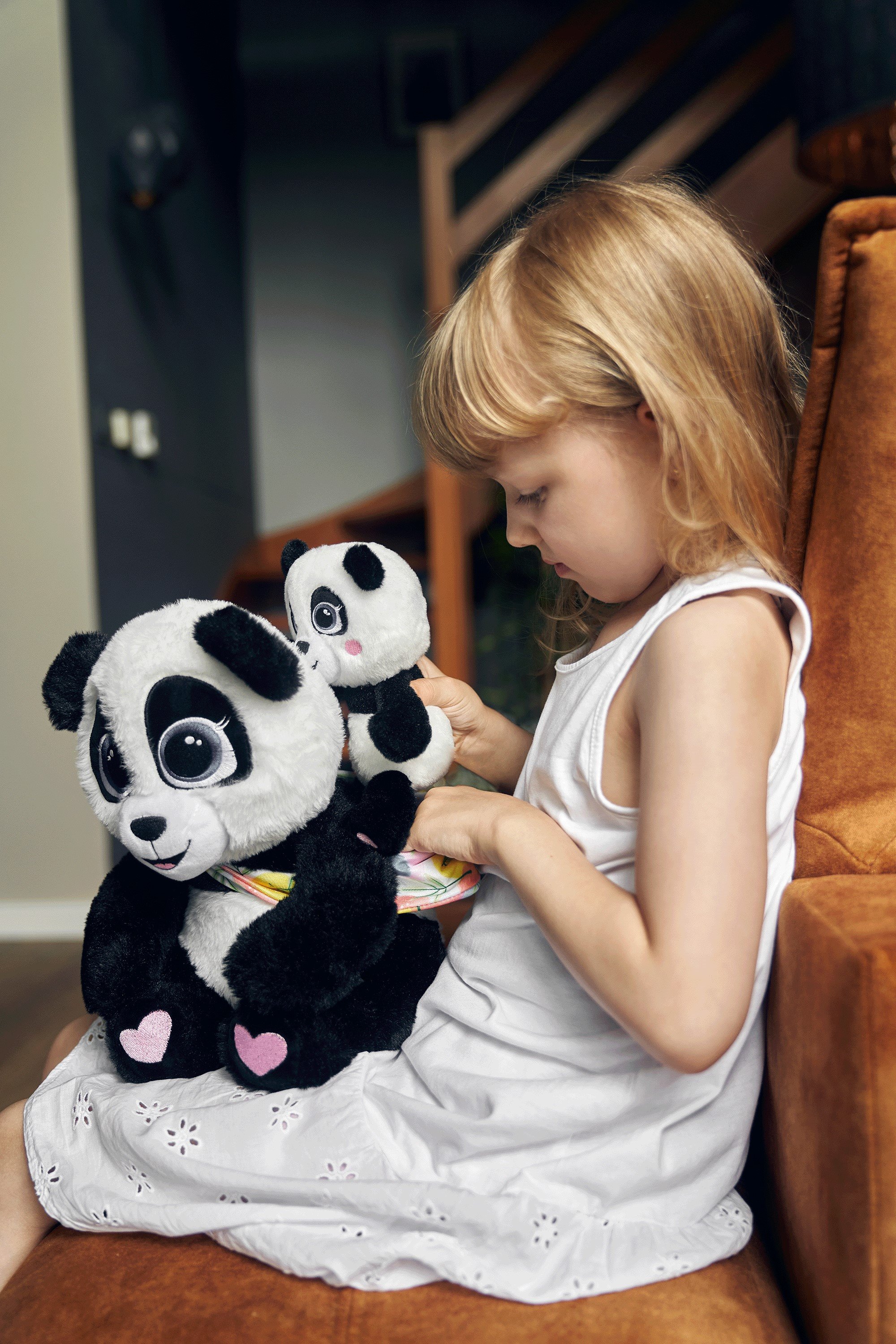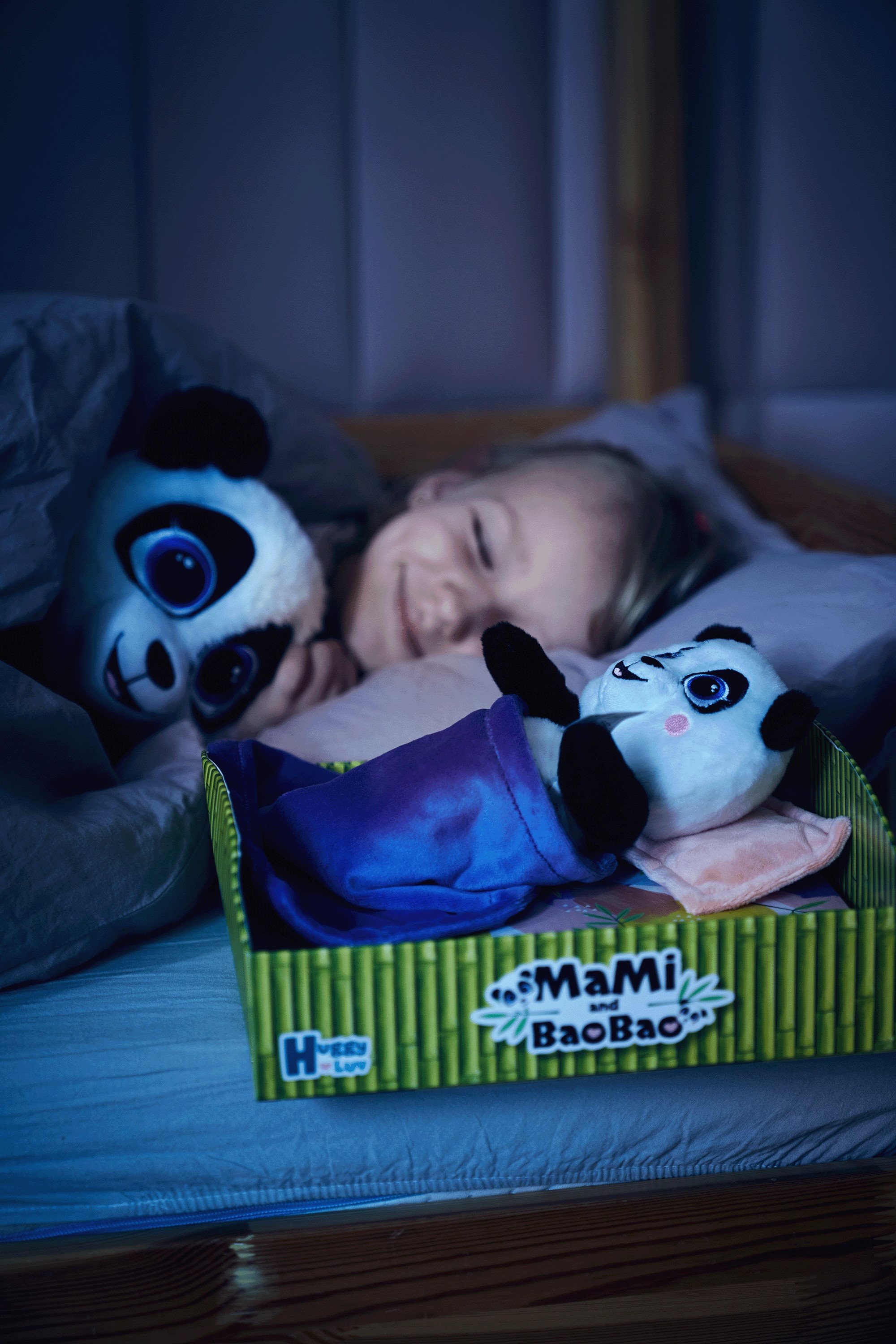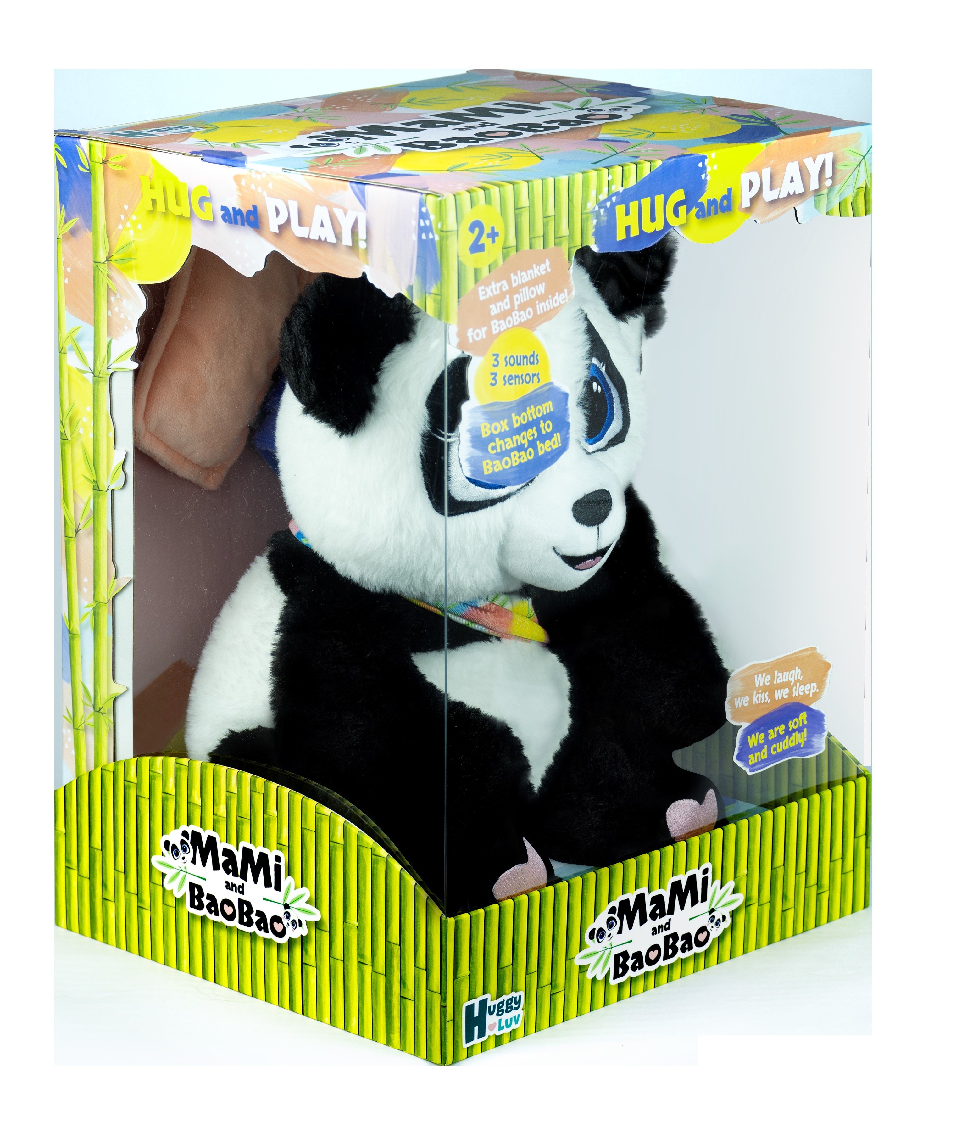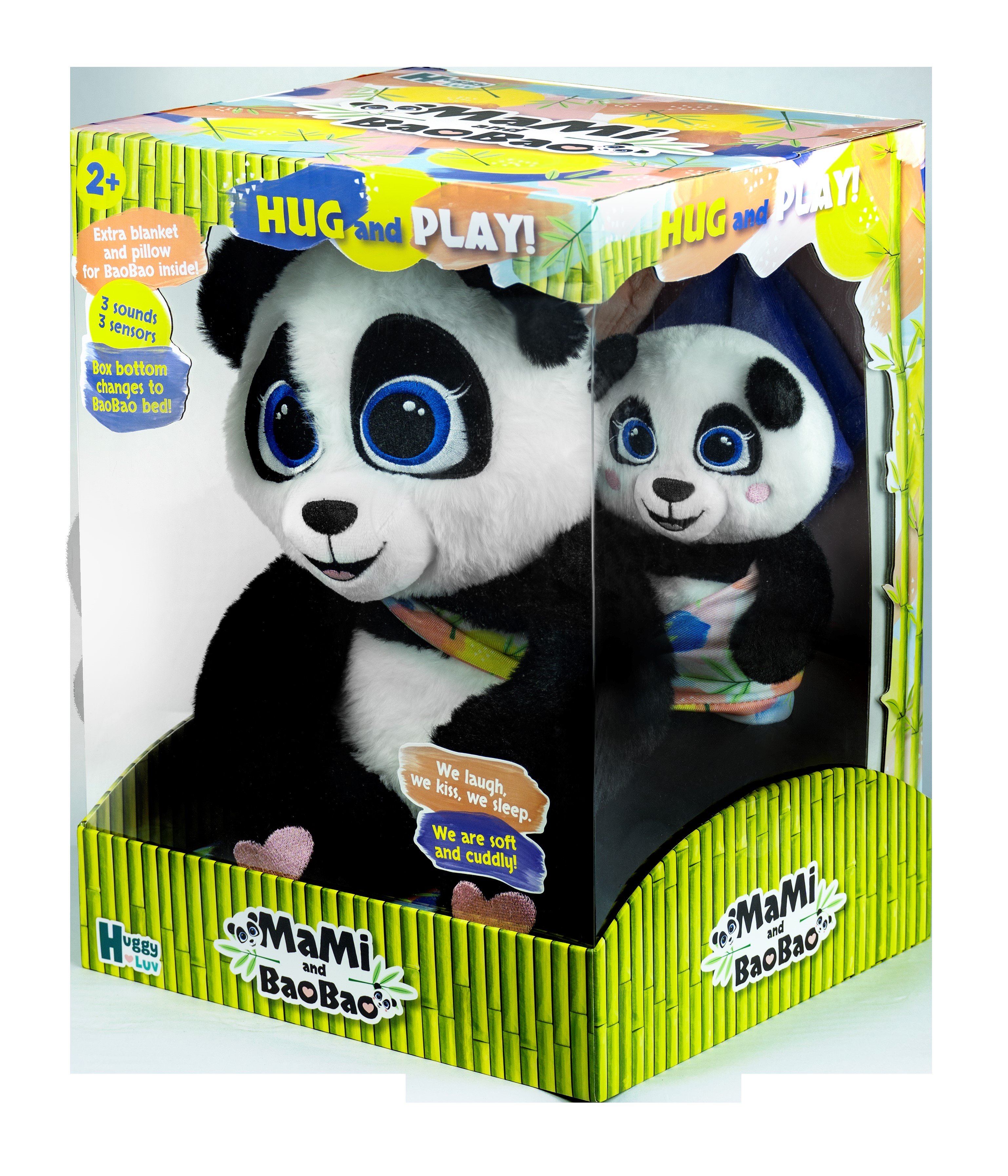Roztomilé interaktivní pandy Mami a BaoBao značky Tm toys okouzlí každé malé dítě. 2 plyšové hračky (maminka a miminko) se zvuky a senzory (bez pohybu). Pandy vydávají 3 různé zvuky – když je miminko položeno na záda maminky, začne hrát ukolébavka. Když se miminko přiblíží k obličeji maminky – ozve se zvuk polibku. Když se miminko přiblíží k jedné z rukou maminky (lechtání) – ozve se smích. Spodní část obalu je určená ke hraní – představuje postel. Balení také obsahuje dečku a polštářek pro miminko.
