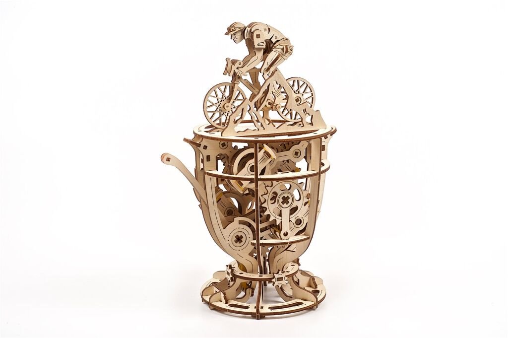 Po seskládání získáte cyklistu na kole umístěného na horní straně poháru. Rozpohybujete ho pomocí páky. Dopřejte si pohled na propracovaný mechanismus a upravujte délku jízdy pomocí mincí a žetonů. Ty vložíte do ramen setrvačníku a pozorujete změnu chování vašeho cyklisty. Naučte své děti, jak setrvačník funguje, nebo obdarujte touto skládačkou nadšence do cyklistiky.
