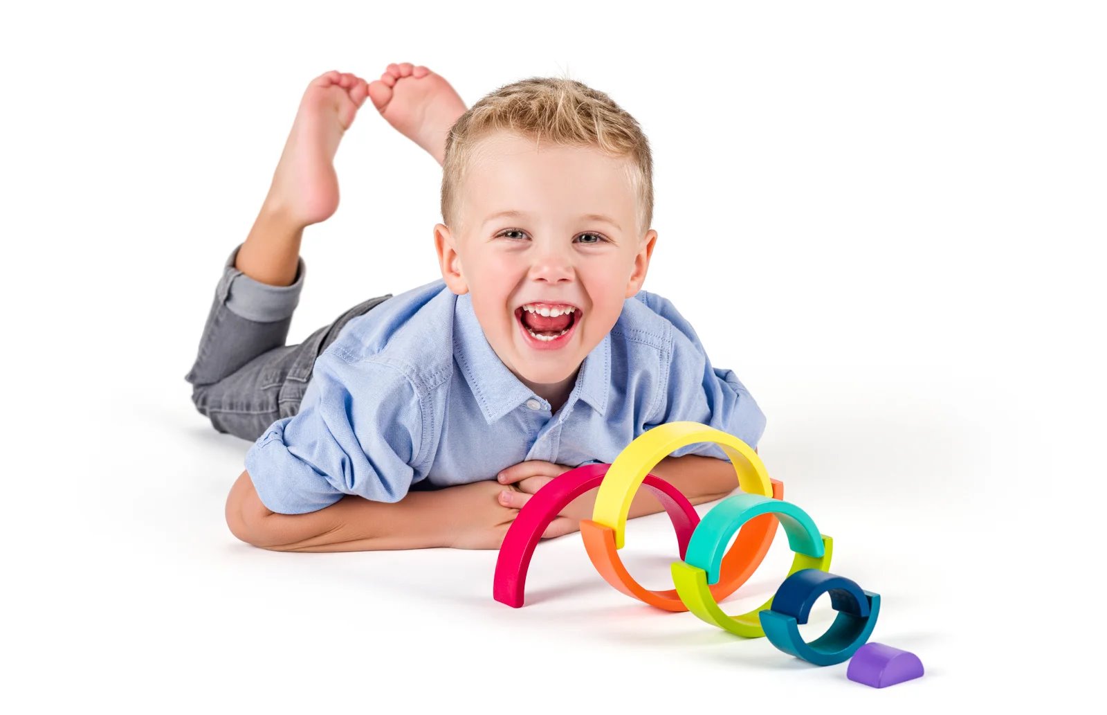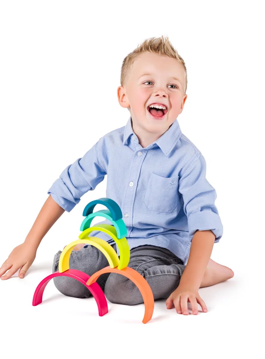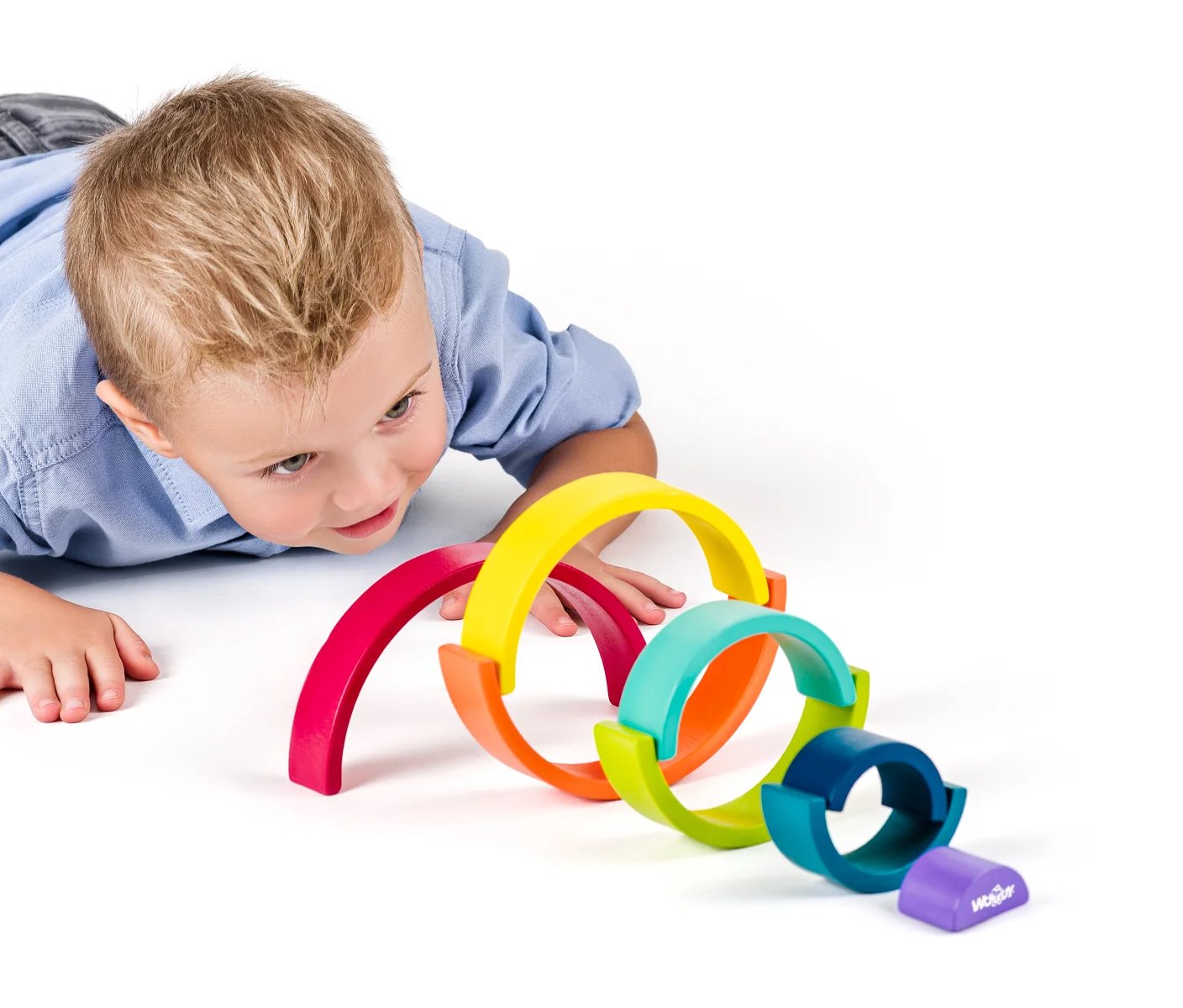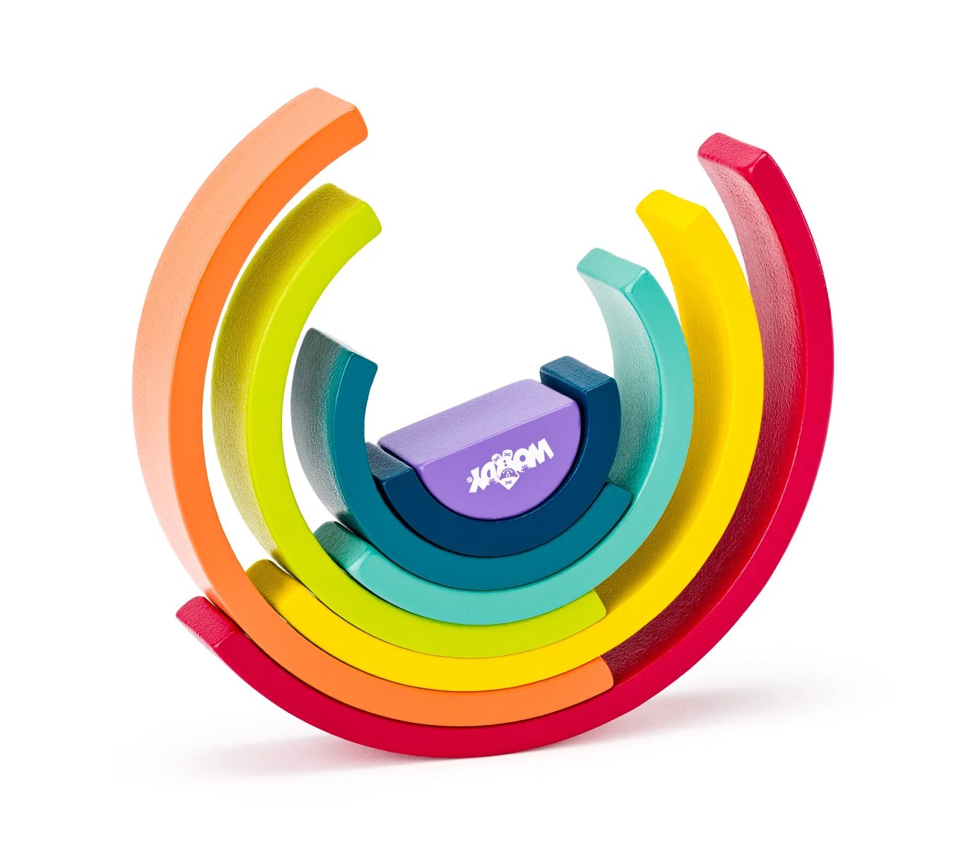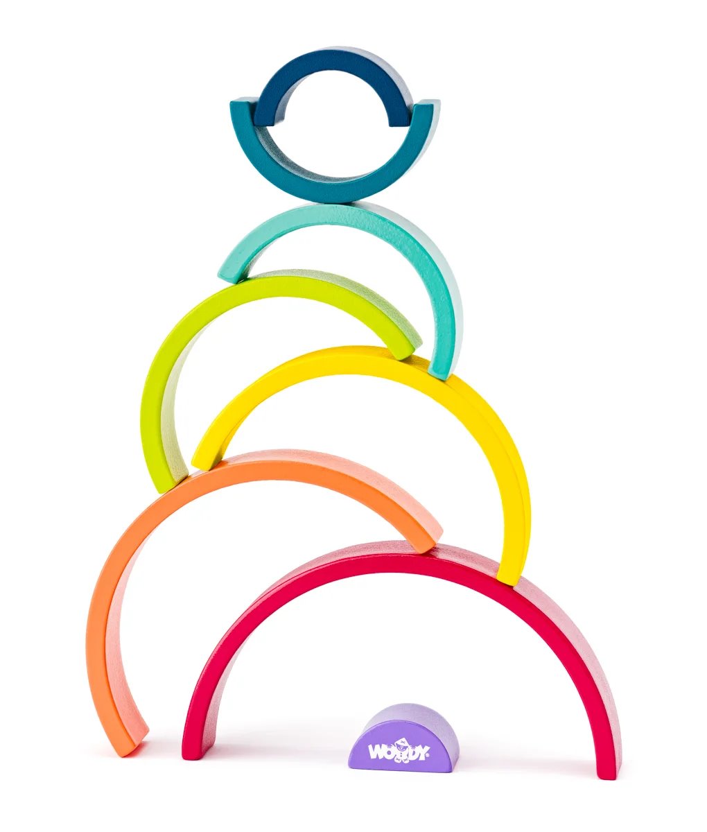 Skládačka a balanční hra v jednom od značky Woody zabaví vašeho potomka na dlouhé hodiny. Obsahuje celkem 8 dílů ve všech barvách duhy. Jednotlivé části skládačky mají tvar oblouků. Dítě je různě skládá do sebe od největšího k nejmenšímu nebo je staví tak, aby dílky nespadly.