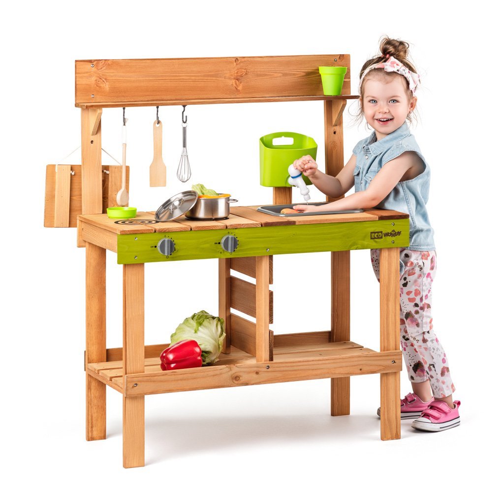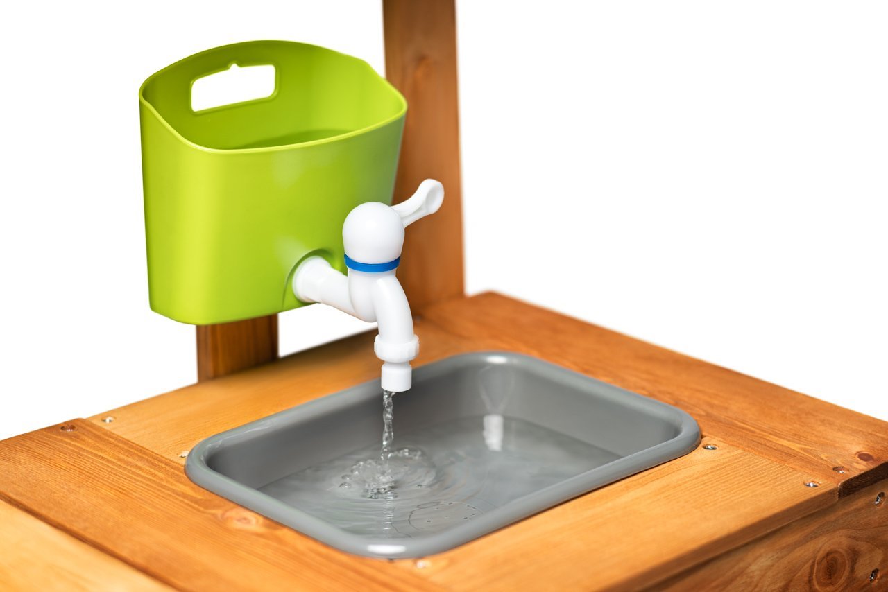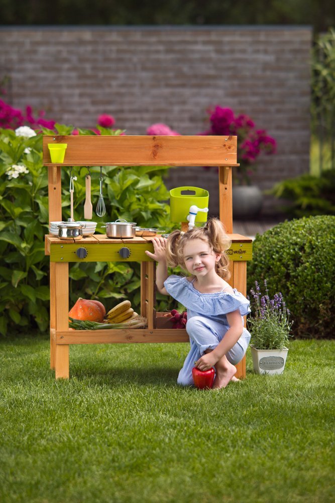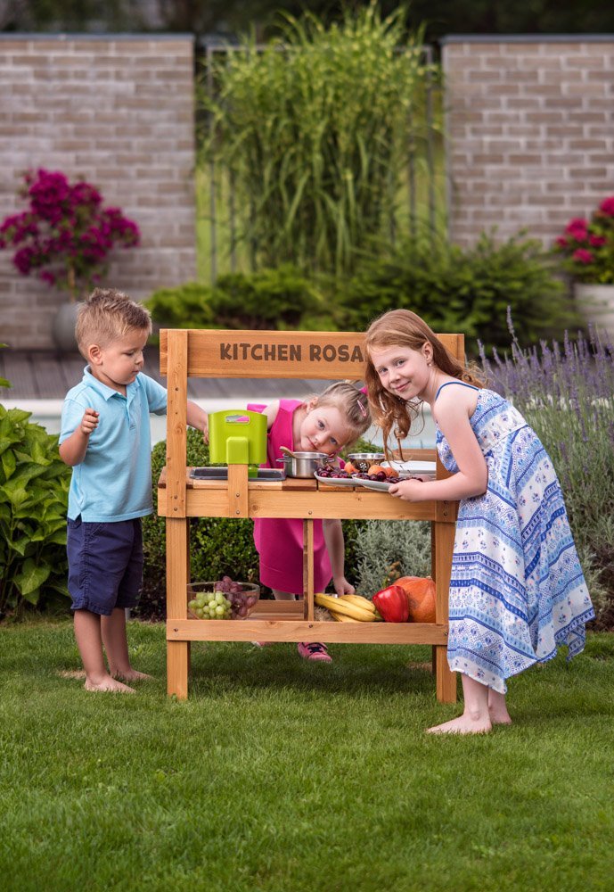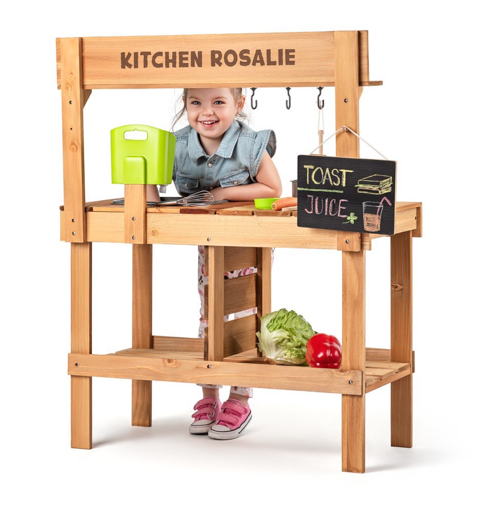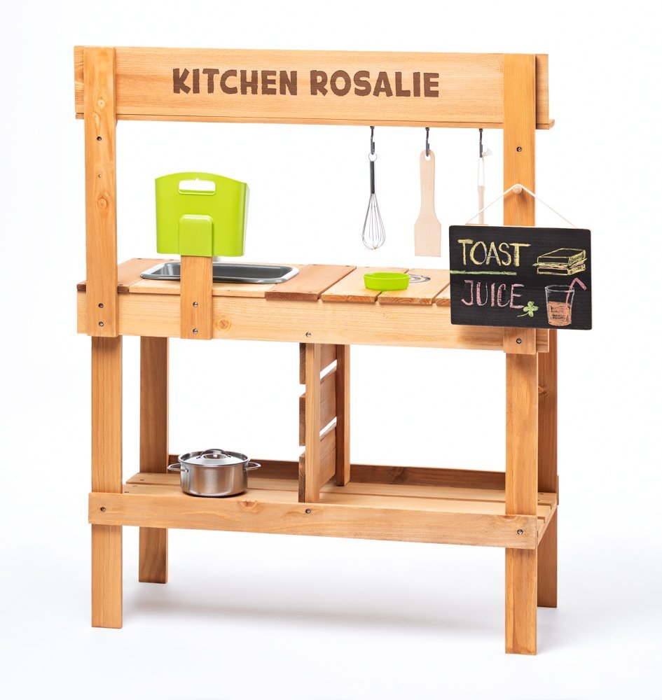 Z jedné strany kuchyňka se dvěma vařiči, z druhé výdejna jídel – to je zahradní kuchyňka Rosalie. Součástí kuchyňky je zásobník na vodu, díky němuž může dítě skutečně omývat ovoce, zeleninu, ale i nádobí a náčiní, které je součástí tohoto výrobku. Hra s vodou děti nadchne a plnění zásobníku se tak stane velmi populární činností. Dřez pod kohoutkem je vyjímatelný a může se tak vylévat dle potřeby. Pod dřezem je prostor pro uskladnění zásob na přípravu pokrmů. Na černou tabulku z výdejní strany kuchyně mohou děti napsat či nakreslit, jaké jídlo dnes pro své kamarády připravily. Zahradní kuchyňka je ošetřená glazurou vhodnou pro děti a je šetrná k životnímu prostředí.