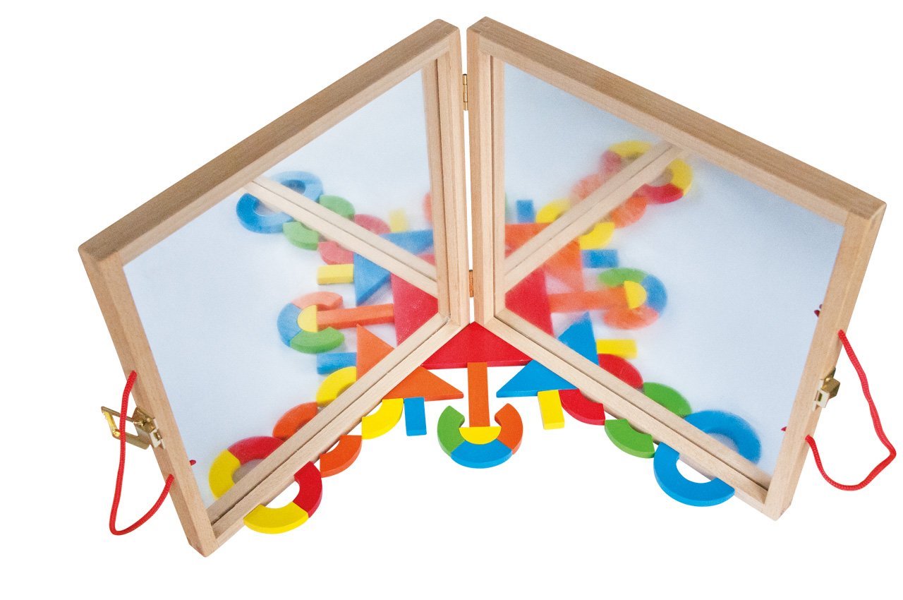 Vnitřní stranu kufříku tvoří zrcadlová fólie. Odráží od sebe složené obrazce a vytváří pravidelné mandaly a jiné obrázky. Jakmile si vaši potomci dohrají, uloží magnetické tvary a karty zpátky do kufříku a zavřou ho. Hračka rozvíjí dětskou kreativitu, jemnou motoriku i logiku.