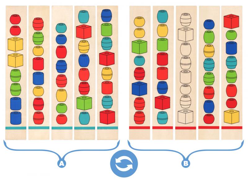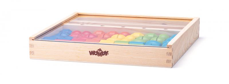 Navlékání dřevěných korálků na tyčky podle předloh. Dítě dle předlohy nakreslené na dřevěných destičkách navléká na tyčku barevné korále, tak aby odpovídaly předloze. Motoricko-didaktická hra, která nenásilnou formou učí děti rozeznávat základní barvy a tvary.