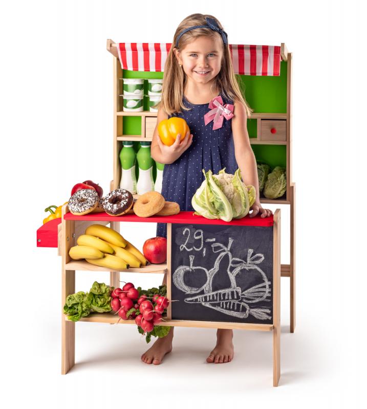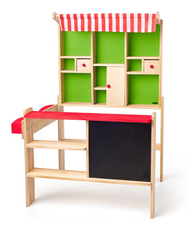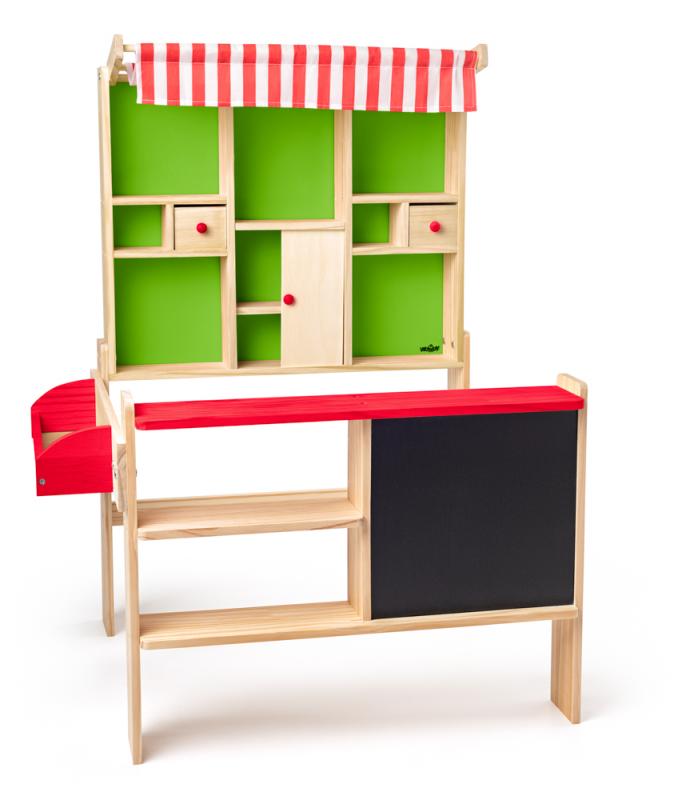 Dřevěná prodejnička značky Woody je to pravé místo, kde si vaše děti mohou hrát "na prodávání". Prodejna je vybavená prodejním pultem, policemi, šuplíky a tabulí, kam děti mohou napsat křídou denní nabídku svého obchůdku. Součástí obchůdku je i ozdobná červenobílá markýza. Námětová hra "na prodávání" rozvíjí dětskou fantazii, komunikaci a sociální dovednosti. Snadná montáž. Obchod nezahrnuje potraviny a příslušenství.