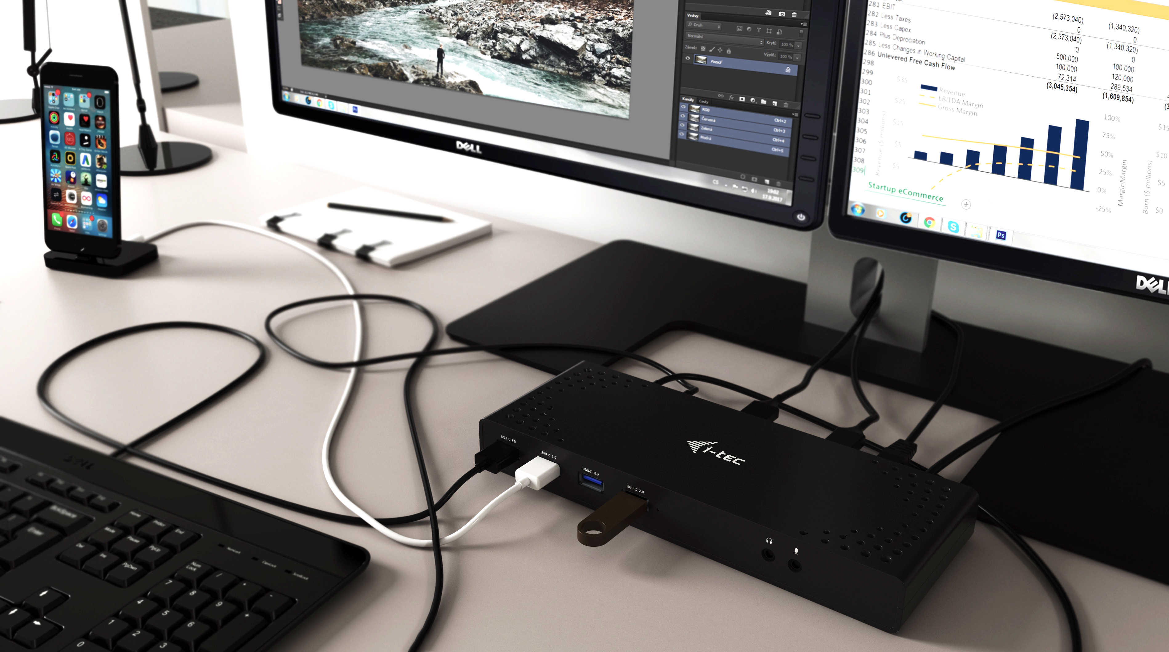 Přizpůsobte si své pracoviště a připojte ke svému notebooku nebo tabletu s USB-A 3.0 nebo USB-C rozhraním své oblíbené příslušenství. Díky této dokovací stanici se vyhnete neustálému připojování a odpojování všech zařízení pokaždé, když si berete váš notebook nebo tablet s sebou. Výhodou je také větší pořádek na pracovním stole, odkud zmizí nepřehledná změť kabelů. Dokovací stanici stačí připojit jediným kabelem a okamžitě ji můžete začít využívat. Oba propojovací kabely (USB-C na C, USB-C na A) jsou součástí balení. Instalace ovladačů je automatická ze systému Win 10, pro ostatní operační systémy si prosím stáhněte ovladače zde.