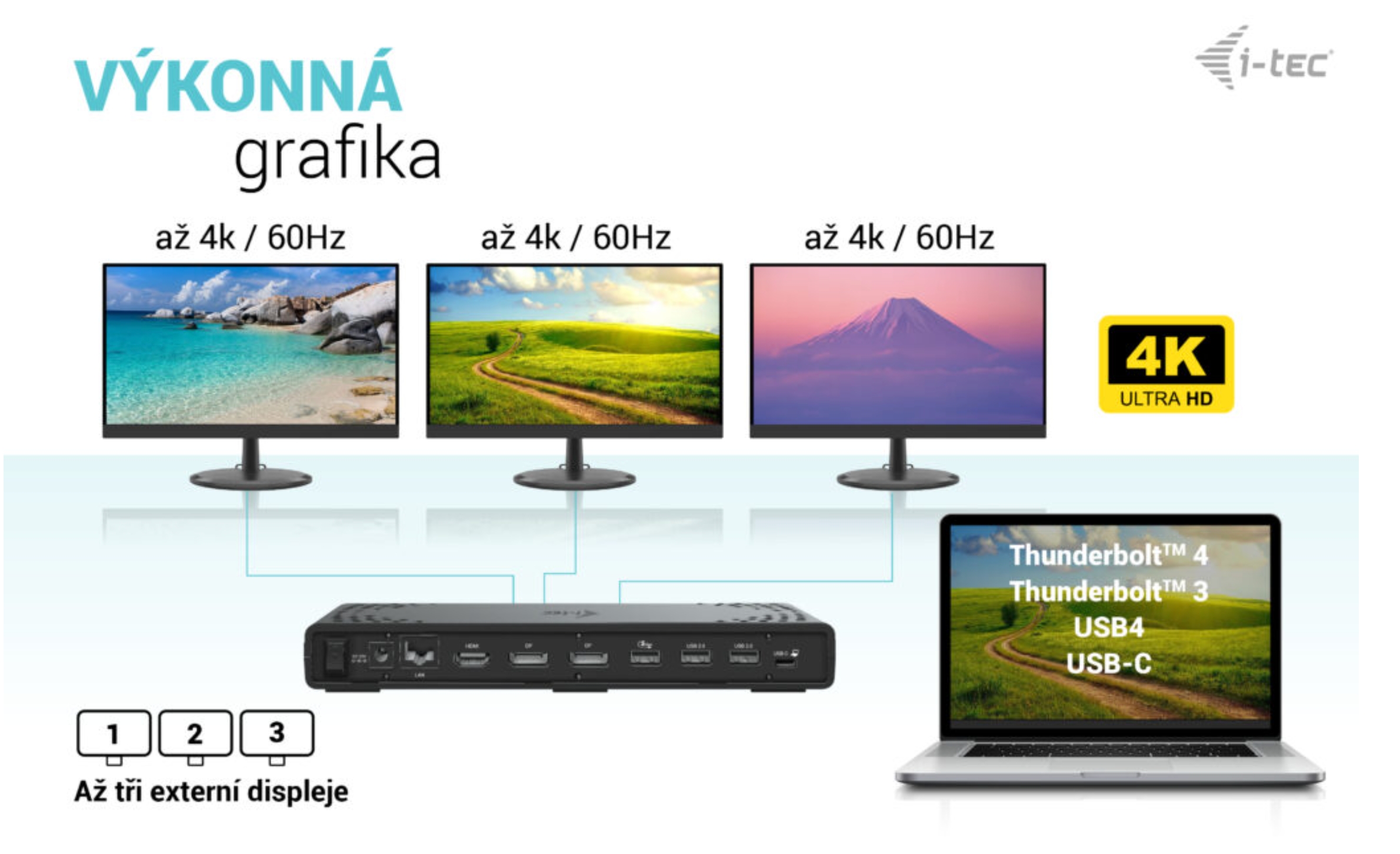 Vysoce výkonná dokovací stanice USB-C nové generace, která podporuje výstup až na tři externí monitory ve vysokém rozlišení až 4K. Dokovací stanici lze používat prakticky se všemi notebooky vybavenými porty USB-C, USB4 a Thunderbolt“ 3/4 a zároveň podporuje všechny běžné současné operační systémy.