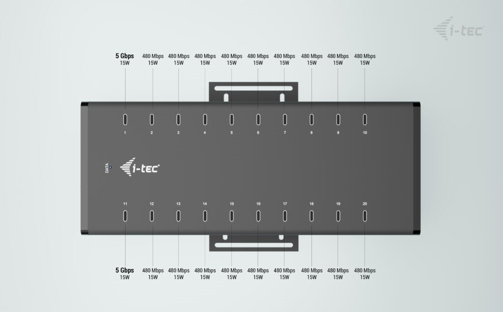 Tento moderní HUB nabízí 20 USB-C s funkcí Plug & Play a nabíjením až 15W na port. Díky tomu, že HUB má 20 USB portů, je možno nabíjet až 20 zařízení najednou.