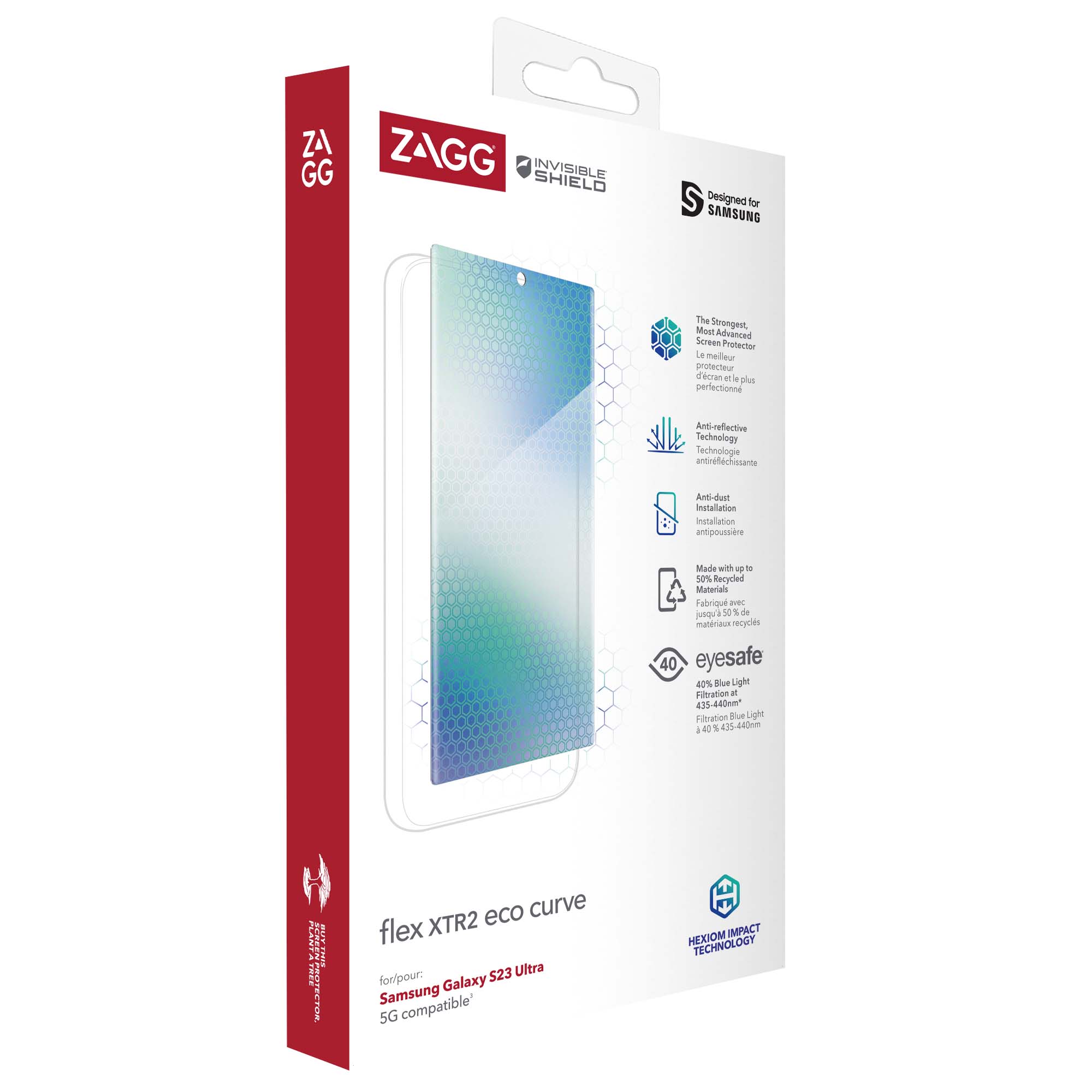 Vysoce odolná hybridní ochrana displeje s filtrem škodlivého modrého světla a antireflexní technologií. Vyrobena za pomoci až 50 % recyklovaných materiálů za pomoci technologie Hexiom, díky které dokáže rozptýlit sílu nárazu. Flex XTR2 Eco je nejsilnější hybridní ochrana.