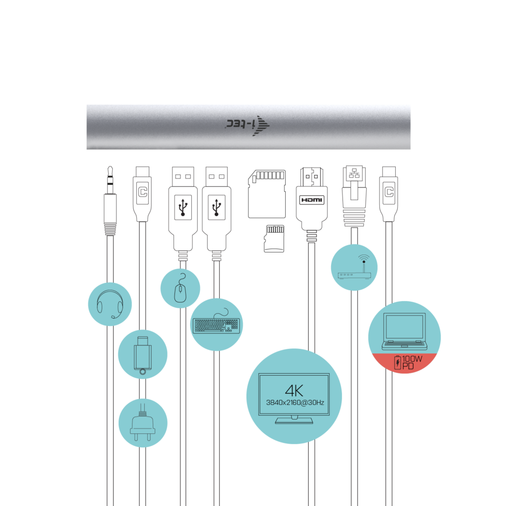 Dokovací stanice je dodávána se 100cm USB-C kabelem, což vám umožní jednoduché a pohodlné připojení k vašemu notebooku, bez ohledu na to, na jaké jeho straně se nachází USB-C/Thunderbolt TM port.