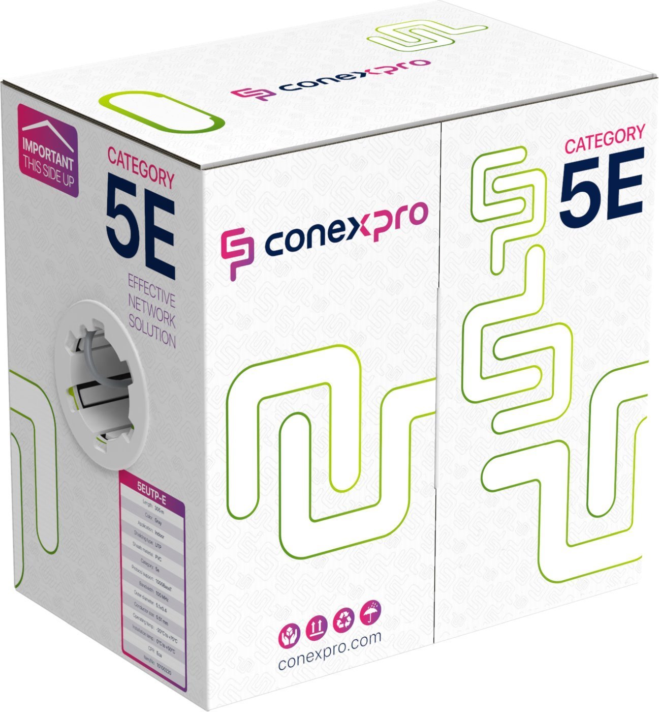 UTP kabel kategorie 5E značky Conexpro využijete především pro vnitřní rozvody strukturované kabeláže. Vodiče z kvalitního hliníkového drátu potaženého vrstvou mědi o průřezu AWG24 jsou chráněné pláštěm z materiálu PVC. Kabel vám zajistí přenos dat rychlostí až 1 Gbps (1000 Base-T). Není stíněný, což ovlivňuje jeho vodivost a zároveň vylučuje použití pro POE instalace.