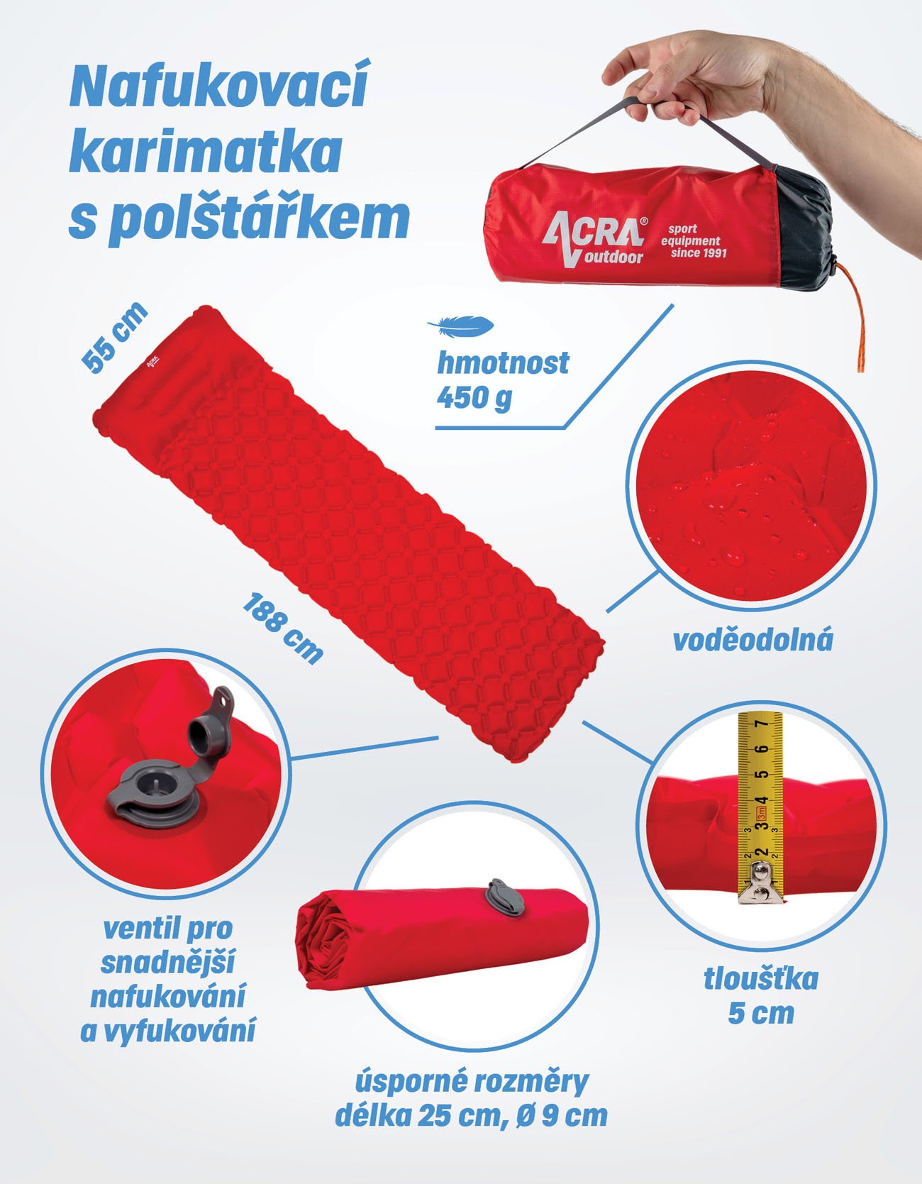 Kempování s karimatkou od značky Acra je příjemné. Oproti klasickým karimatkám vám zajistí pohodlné ležení. Snadno ji kamkoliv přenesete díky nízké hmotnosti. Zároveň je skladná a má dlouhou životnost. Vyhněte se ovšem přímému slunečnímu záření a nadměrným teplotám.