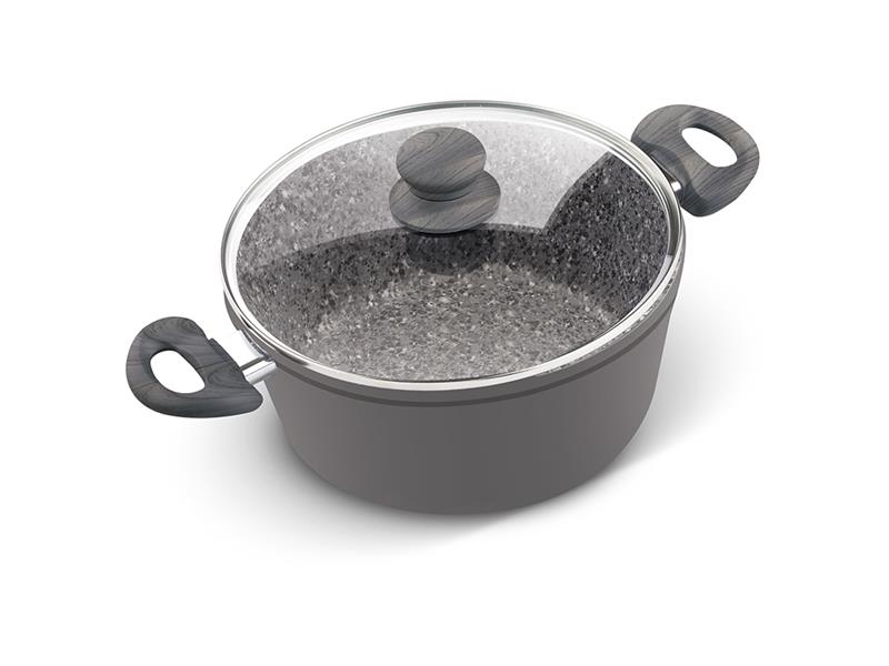 Pánev opatřena vnitřním marble povrchem odolným proti oděru a připalování, silným dnem a velmi elegantní soft rukojetí.