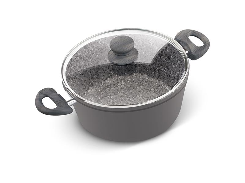 Pánev opatřena vnitřním marble povrchem odolným proti oděru a připalování, silným dnem a velmi elegantní soft rukojetí.