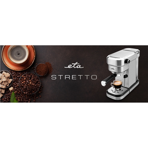 Pákový kávovar na mletou kávu ETA Stretto v elegantním nerezovém designu vám díky příkonu 1350 W dopřeje oblíbený životabudič přesně tak, jak ho máte rádi. Kromě přípravy lahodné kávy můžete využít funkci horké vody, se kterou hravě připravíte čaj a jiné teplé nápoje. Kávovar umožňuje individuální nastavení množství a objemu kávy pro jeden nebo dva různě velké šálky. Praktický slim design o šířce základny 14,5 cm vám usnadní jeho umístění kamkoliv si budete přát.