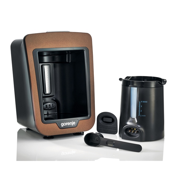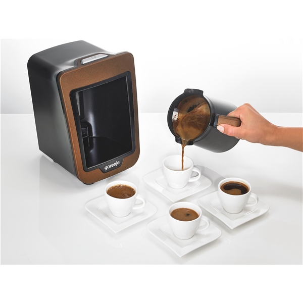 Kávovar turecké kávy značky Gorenje vás na první pohled zaujme krásným a elegantním designem. Vychutnejte si chuť pravé turecké kávy díky optiglow technologii a připravte si doma nebo v práci až 4 šálky za 3 minuty.