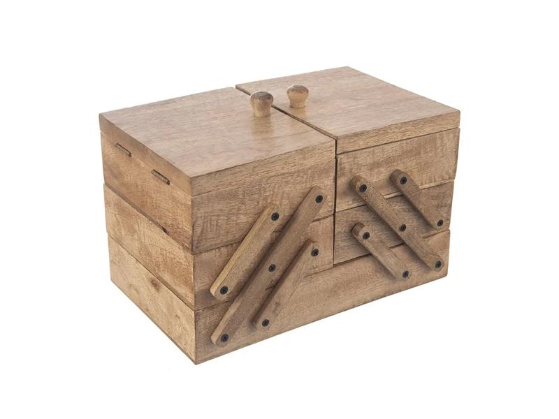 Rozkládací kazeta na šití přehledně uloží potřeby na šití, vyšívání, háčkování... Můžete ji využít také jako šperkovnici nebo úložný prostor na jiné drobnosti. Je rozdělena do 5 úložných sekcí, má dvě odklápěcí víčka. Technické parametry: Materiál: dřevo mango, kov, mosaz (panty), magnet Rozměry: 30,5/72x20x21 cm