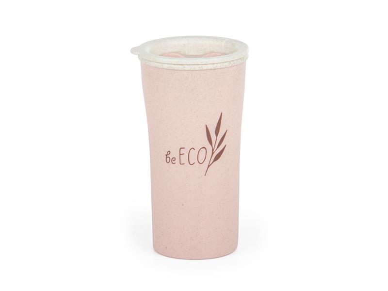 Růžový cestovní hrníček o objemu 450 ml z ekologického materiálu s dvojitými stěnami a dvojitým víčkem s uzavíratelným otvorem na pití udrží teplé i studené nápoje v požadované teplotě.