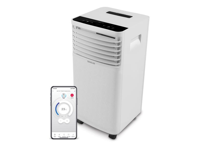 Mobilní klimatizace s Wi-Fi - Chladicí výkon 7 000 BTU/h - 3 režimy provozu: Cool / Fan / Dry - Wi-Fi ovládání mobilní aplikací Sencor HOME - Kompletní sada pro odvod teplého vzduchu a těsnění oken - Max. velikost místnosti: 21-26 m2 / 54-67 m3 (výška stropu 2,6 m) - Odvlhčování (18 l/den) - Samostatný ventilátor - 2 úrovně nastavení rychlosti…