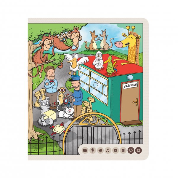 Interaktivní mluvící dětská kniha Zvířátka v ZOO z edice Kouzelné čtení zavede děti od 2 let do jedné malé zoologické zahrady, kde na vrátnici pracuje pan Votýpka. Pan Votýpka je velmi oblíbený u všech zvířátek v ZOO, a tak není divu, že když se blíží den jeho narozenin, zvířátka by mu ráda dala nějaký dárek. Zaposlouchejte se do příběhu šneka Augustýna. Poví vám, jaký narozeninový dárek zvířátka pro pana Votýpku vybrala a jak ho pořídí, když nemají peníze. V knize si poslechnete rytmickou písničku a nechybí ani zábavné kvízy ve 2 obtížnostech. Kniha Zvířátka v ZOO obsahuje přes 1200 zvuků a textů.