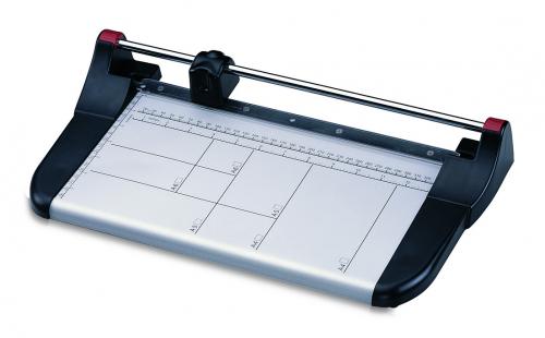 Kvalitní kolečková řezačka s pevnou kovovou základnou a řeznou hlavou umístěnou na kovové tyči, určena pro formát A4. Pracovní stůl je vybaven natištěnými měřítky a přítlačnou lištou z průhledného plastu.