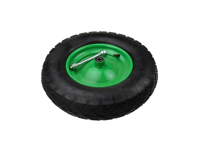 Nafukovací kolo pro záhradní vozíky, kolečka. Odolný ocelový disk malovaný práškovo poskytuje zvýšenou stabilitu. Celek je vyroben z vysoce kvalitních materiálů.