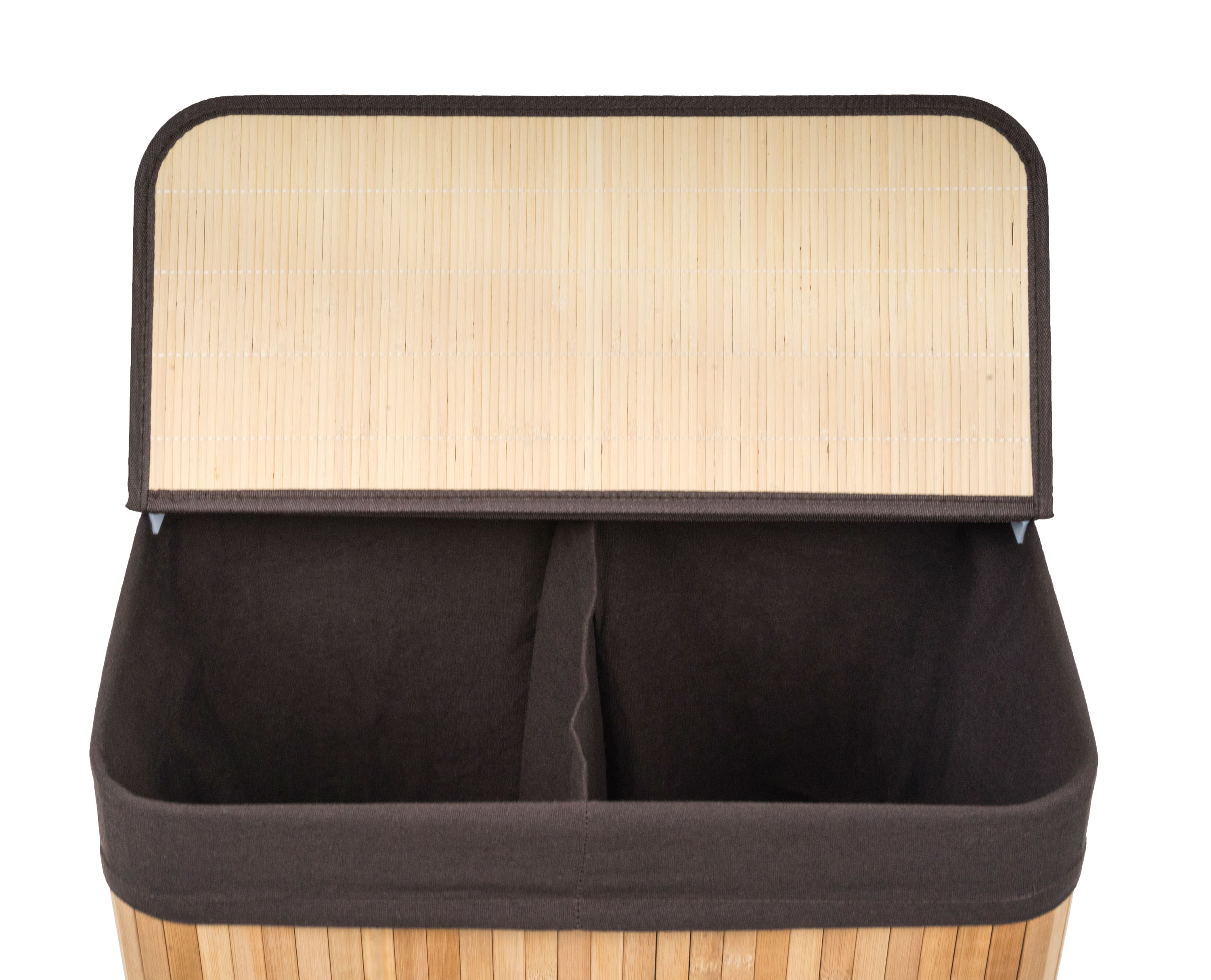 Bambusový koš G21 s pevným víkem má pratelnou látkovou vložku, rozdělenou na dva samostatné oddíly. Špinavé prádlo tak můžete třídit už před praním a umístit zvlášť kousky podle materiálu nebo barvy.