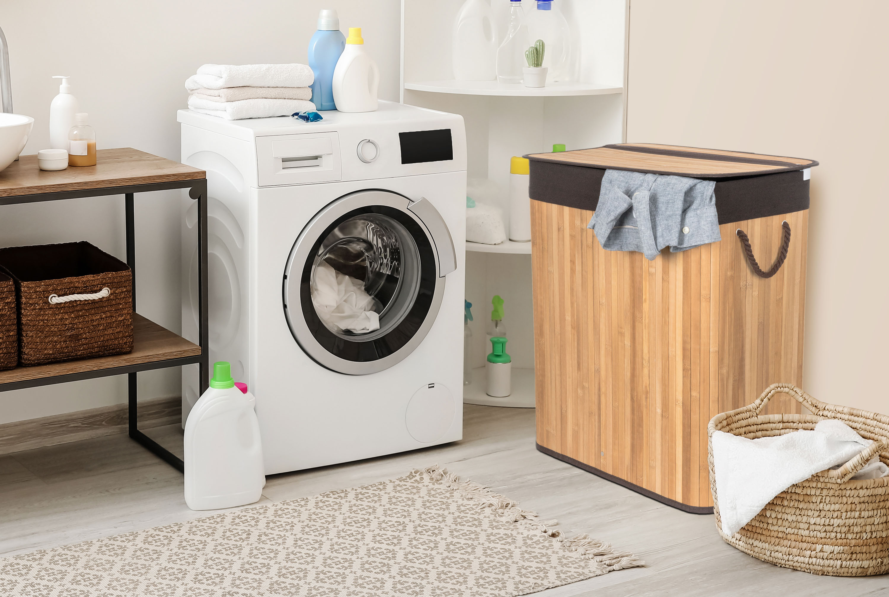Jak vybrat nejlepší koš na špinavé prádlo? Co se materiálu koše týče, doporučujeme jednoznačně bambus. Je odolný vůči vlhkosti, takže jej můžete bez obav umístit do koupelny nebo servisní místnosti s pračkou. Zároveň je i vizuálně velmi příjemný – kombinace přírodního materiálu a barevně sladěné vložce a držadlům evokuje pocit čistoty, navíc se i hodí k jakémukoliv interiéru.