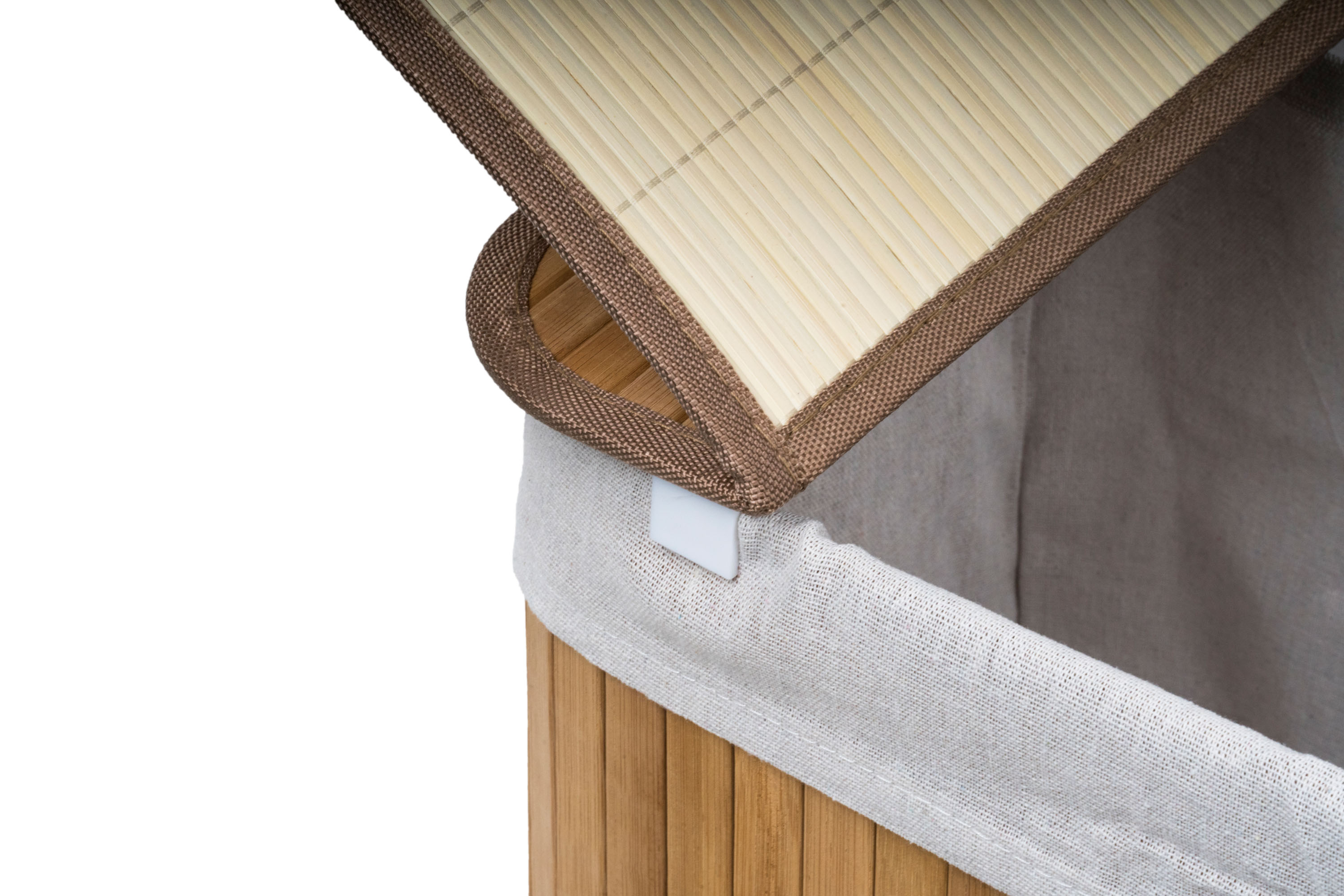 Bambusový koš G21 s pevným víkem má pratelnou látkovou vložku, rozdělenou na tři samostatné oddíly. Špinavé prádlo tak můžete třídit už před praním a umístit zvlášť kousky podle materiálu nebo barvy.