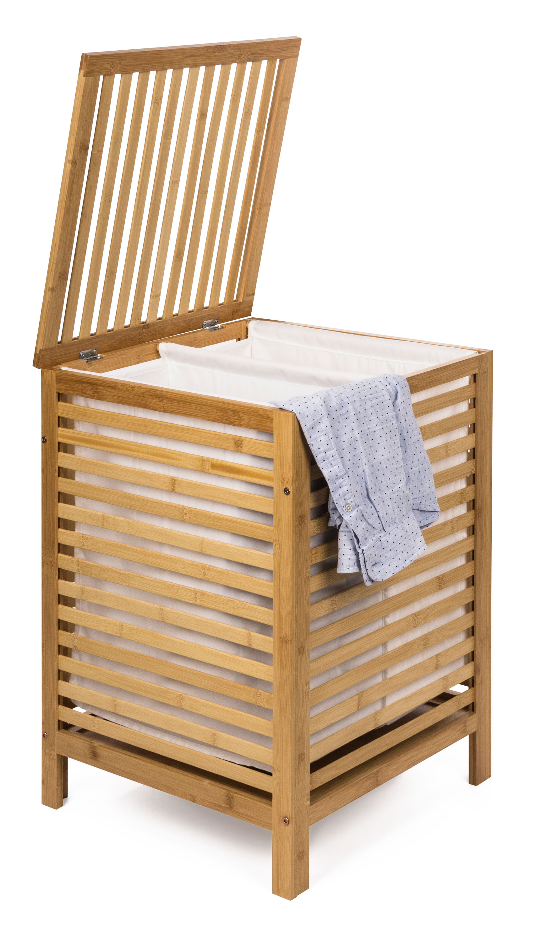Bambusový koš G21 s pevným víkem má pratelnou látkovou vložku, rozdělenou na dva samostatné oddíly. Špinavé prádlo tak můžete třídit už před praním a umístit zvlášť kousky podle materiálu nebo barvy.