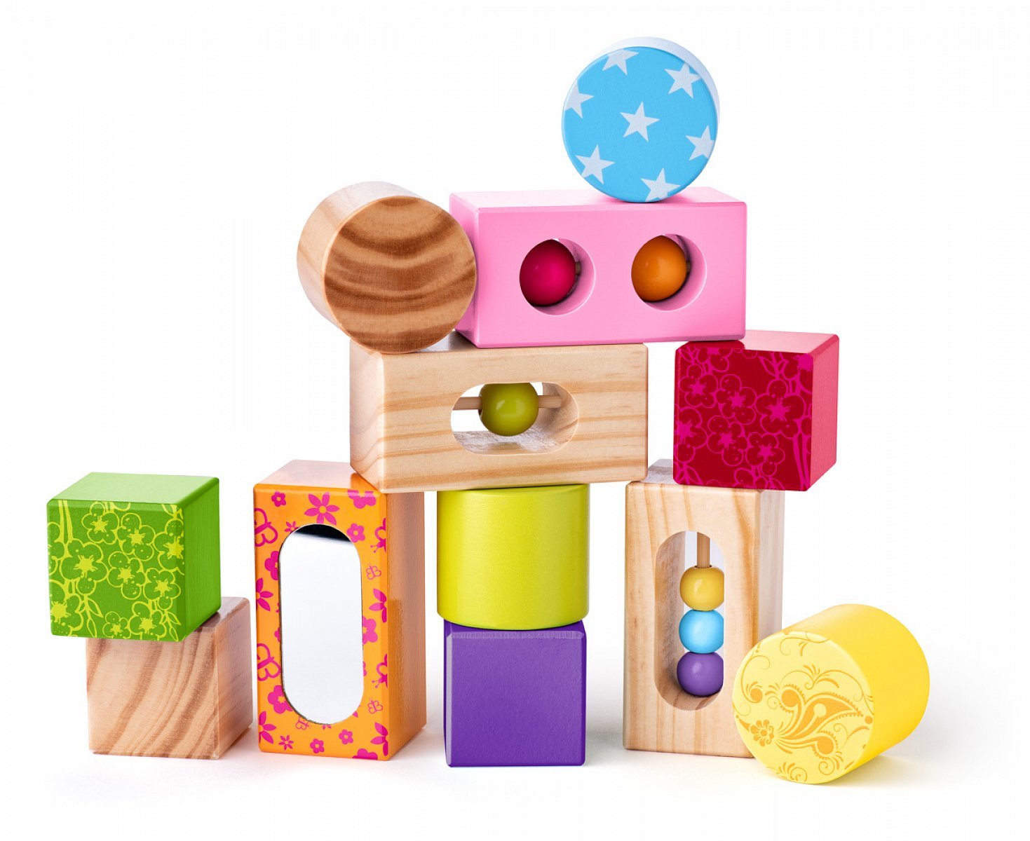 Dřevěné kostky značky Niny s potiskem pro batolata obsahují otočné kuličky a nalepené bezpečnostní zrcátko, které je u takto starých dětí velmi oblíbeným prvkem. S těmito všestrannými kostkami se děti naučí poznávat tvary a barvy. Při hraní si navíc děti procvičují jemnou motoriku, logické myšlení i trpělivost.