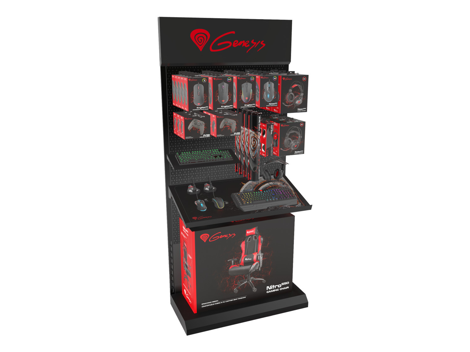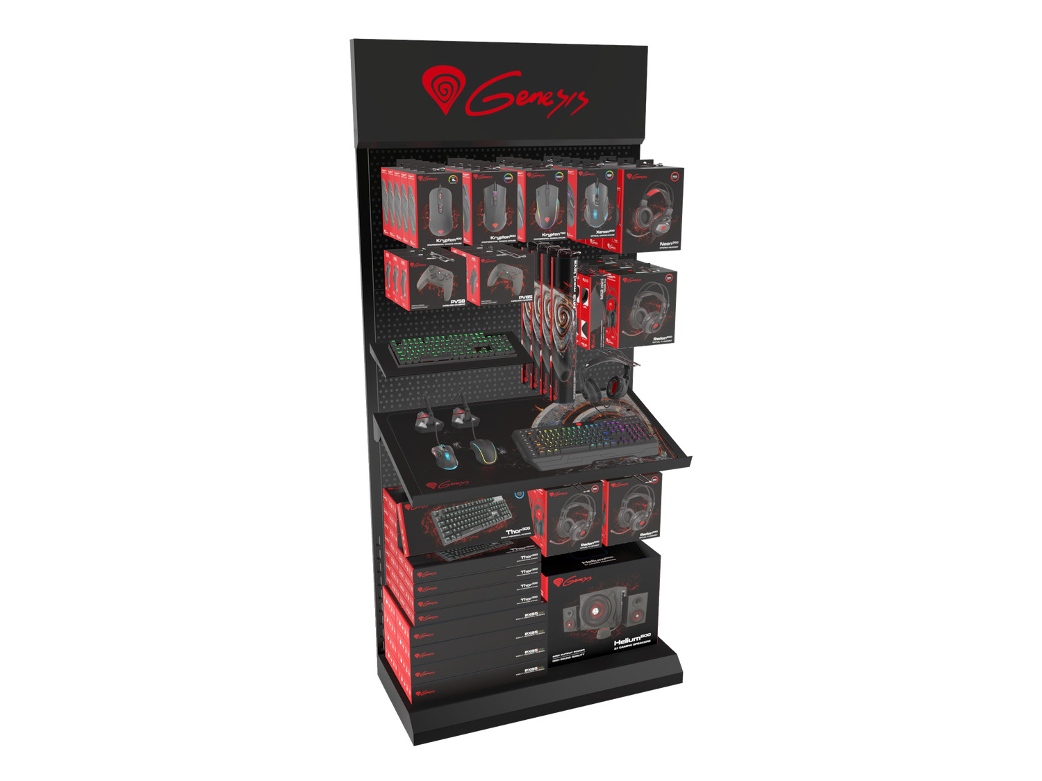 Kovový stojan pro produkty Genesis, který obsahuje háčky pro zavěšení produktů a 2 police k expozici Demo kusů. V balení také najdete multimediální Android TV box spolu s rozbočovačem na 7 USB portů, který slouží k podsvícení Demo kusů, což ještě více podkreslí atraktivní vzhled produktů Genesis. Dodatečně Android TV box obsahuje multimediální…