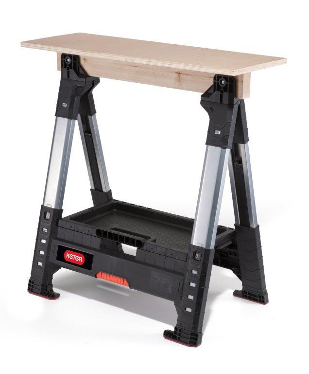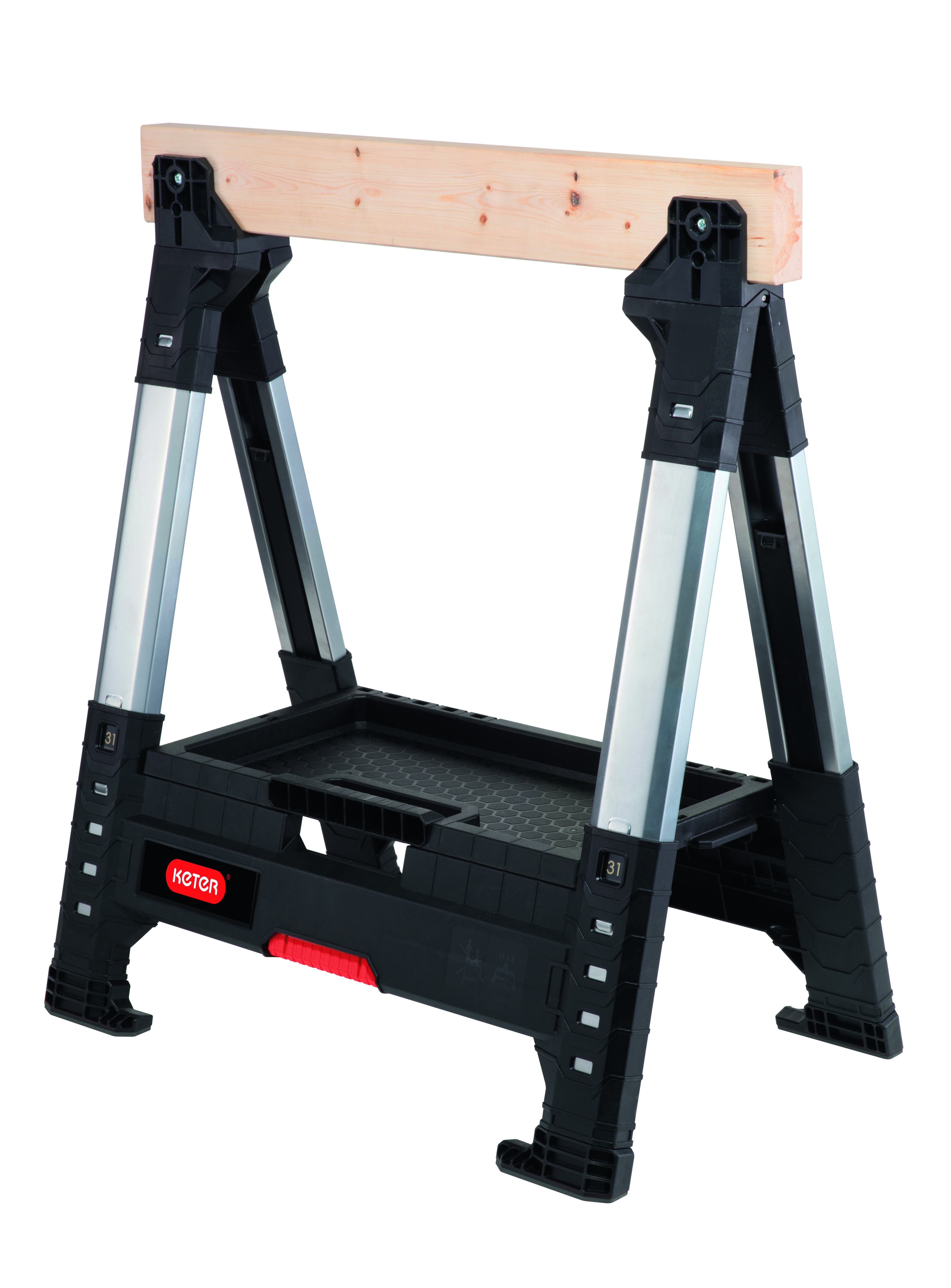 Dílenská koza Lumber Jack sawhorse značky Keter má odolné kovové nohy, které vyrovnávají povrchové nerovnosti, neboť je lze výškově přizpůsobit nezávisle na sobě. Výšku kozy 80 až 100 cm snadno upravíte pomocí jednoduchého mechanismu.