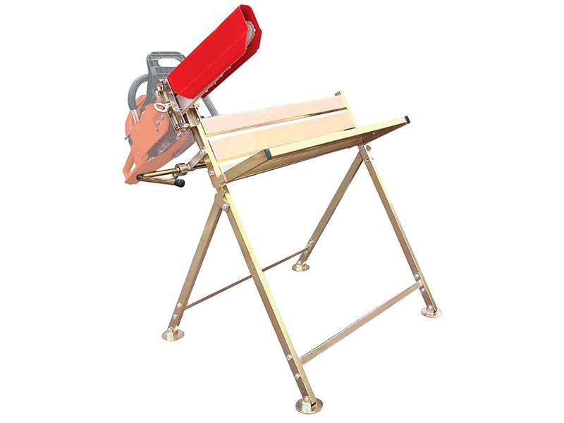 Stojan na řezání dřeva s držákem řetězové pily umožňuje řezání kulatiny, prken, palet nebo trámů.