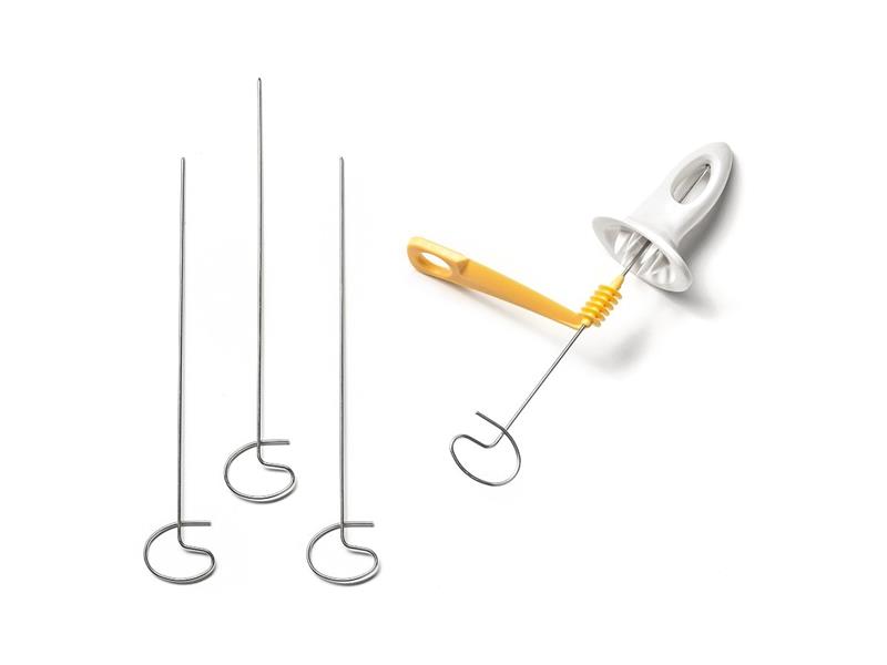 - Sada obsahuje plastový držák na brambory, plastový kráječ (spirálový kráječ) a 4 kovové špejle