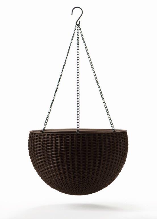 Závěsný květináč Hanging Sphere značky Keter připomíná svým designem přírodní ratanovou vazbu v hnědé barvě whiskey. Skvěle tak doplní jak moderní, tak i tradiční look okolí. Květiny v něm přirozeně vyniknou.