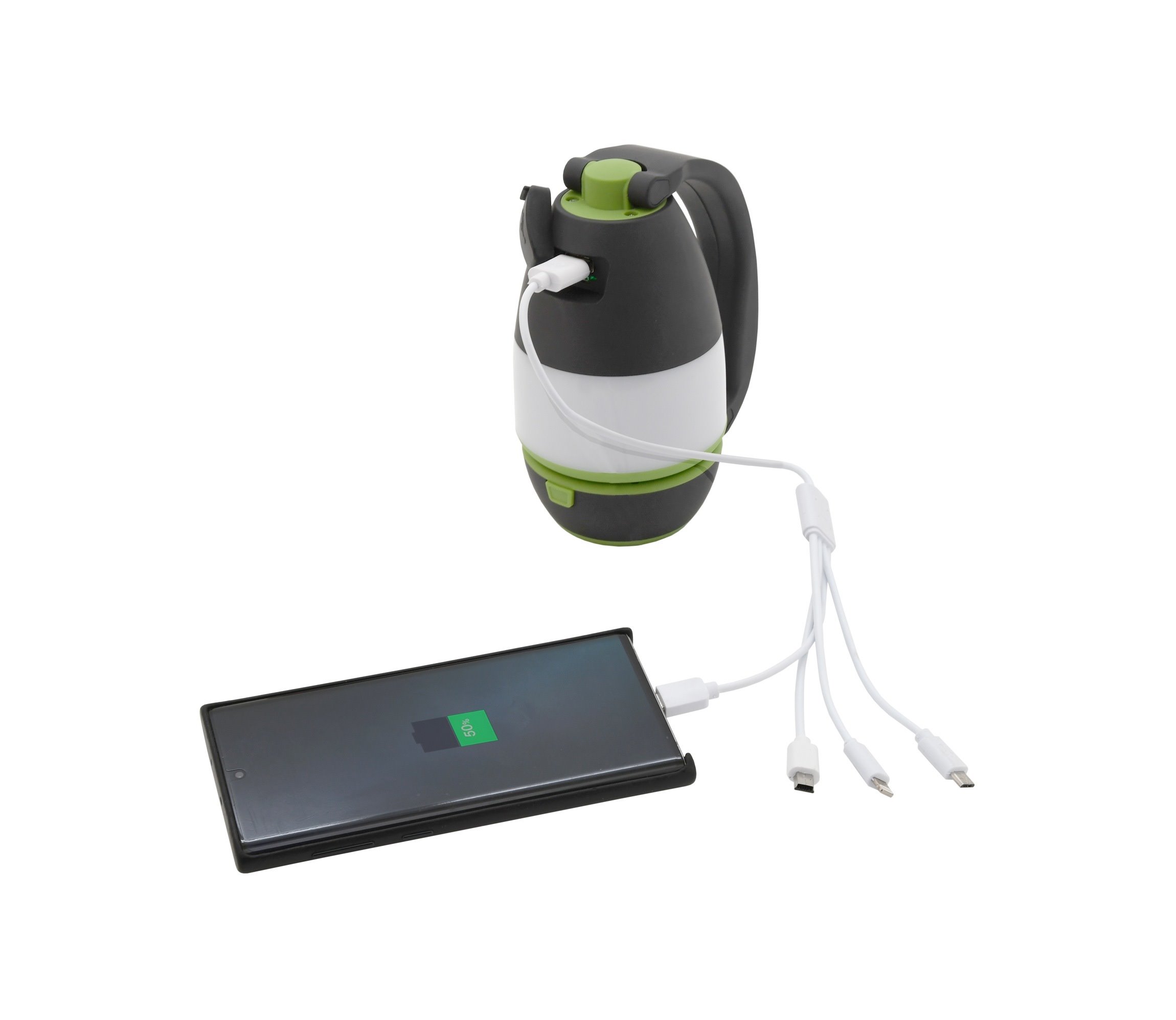 Na rukojeti se navíc nachází 4polohový vypínač. Vyberete si mezi slabým a silným osvětlením střední části lampičky. Přední poloha rozsvítí čelní LED a vytvoří baterku. Zároveň svítilnu využijete i jako powerbanku. Pod gumovou krytkou naleznete USB zásuvku, ke které můžete připojit přiložený napájecí kabel s microUSB, USB-C a IPhone konektorem.