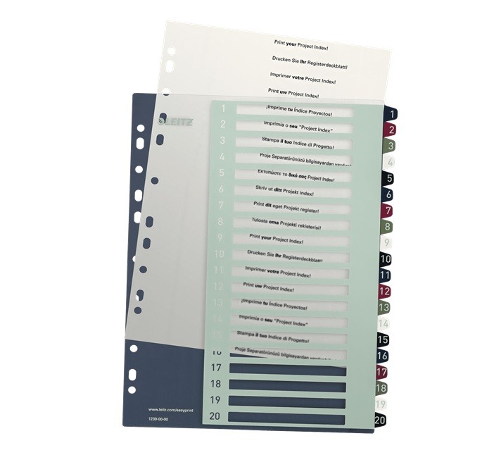 Opakovatelně použitelný a extra odolný plastový rejstřík ve stylových barvách.. Potisknutelný na PC pro upravení dle vlastních potřeb pomocí nástroje na www.leitz.com/easyprint