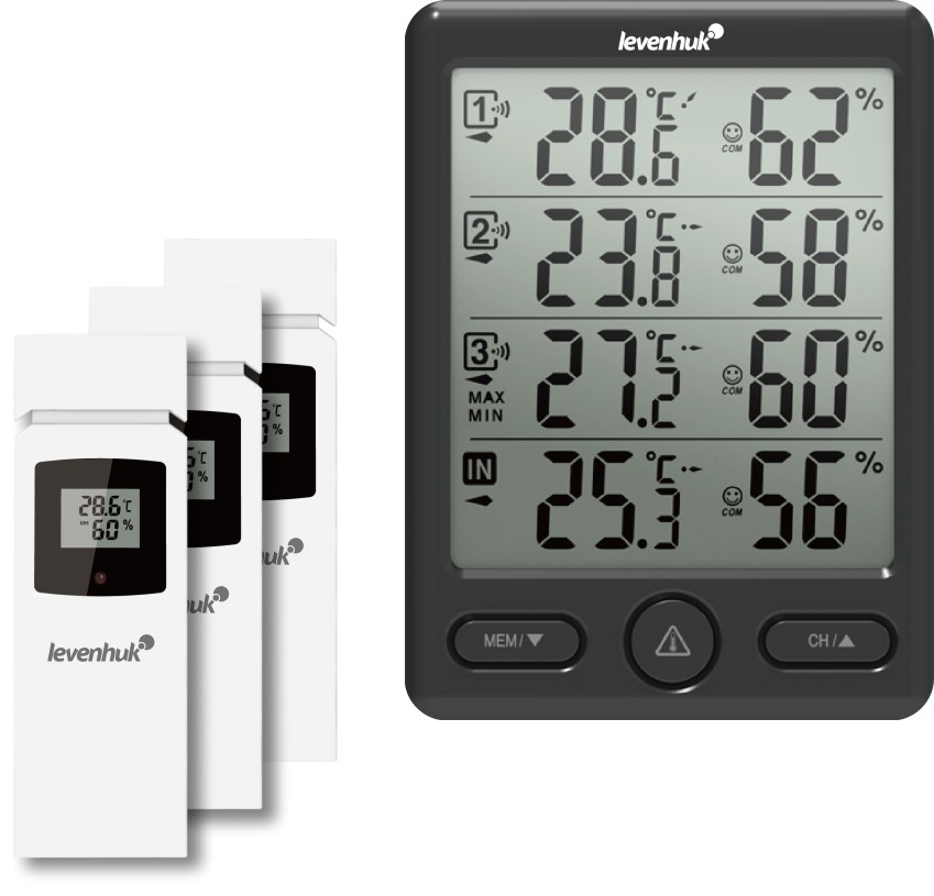 Díky meteorologické stanici Levenhuk Wezzer PLUS LP20 se dozvíte, jak se vhodně obléct, aby vám nebyla venku zima nebo naopak příliš velké horko. Pomůže vám při sledování změn počasí a mikroklimatu v místnostech nebo budovách na pozemku. Jelikož měří teplotu a vlhkost na 4 místech současně, budete mít vždy o těchto hodnotách přehled. Základna stanice zjišťuje stav teploty a vlhkosti v místě instalace. Můžete ji přimontovat ke stěně nebo ji umístit na rovný povrch. Dálkové ovládání třech bezdrátových senzorů přenesou údaje do základní stanice pomocí rádiového spojení. Senzory také připevníte ke stěně, ovšem dbejte na to, aby zůstaly nejdále 30 metrů od základnové stanice.