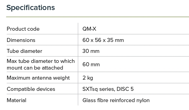 QM-X umožňuje snadnou instalaci prvků do hmotnosti 2kg na stožár (30-60mm) a jejich elevaci ve vertikální i horizontální rovině.