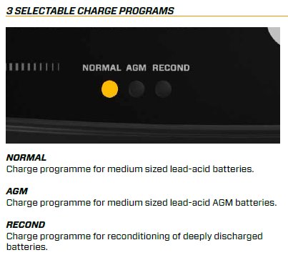 Maximální napětí: Normal 14,4 V, AGM 14,7 V, Recond 15,8 V