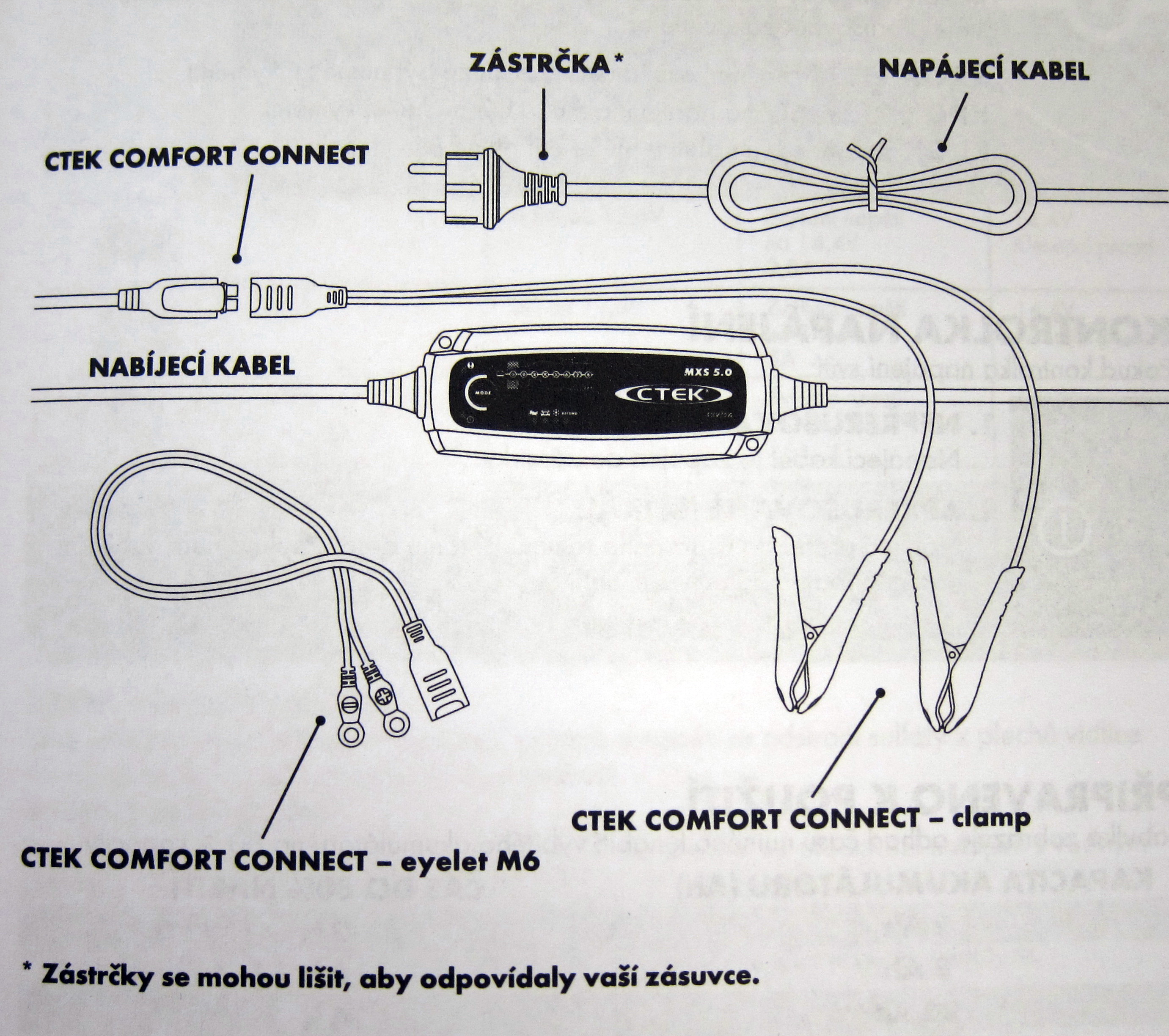 Nabíječka se dodává se dvěma sadami konektorů (krokosvorky, oka)