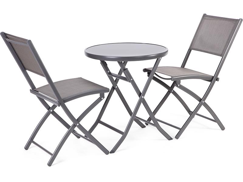 Balkónový set se skládá ze 2ks židlí a stolu Technické parametry: - Rozměry stolu: 60 x 60 x 71 cm - Deska stolu z černého tvrzeného skla - Materiál stolu: kovová konstrukce - Rozměry židle: 57 x 47 x 76 cm (2 ks v balení) - Materiál židle: ocelová konstrukce - Výplň židle z odolné umělé textílie - Nosnost židle 100 kg - Pro venkovní i vnitřní…