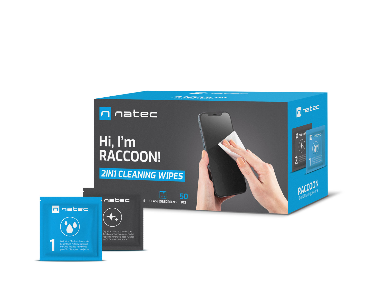 Natec Raccoon Cleaning 2in1 Wipes je sada vlhčených a suchých ubrousků určených k čištění obrazovek - displejů chytrých telefonů, tabletů, fotoaparátů, monitorů a skleněných povrchů. Díky samostatnému balení ve vzduchotěsných sáčcích je výrobek ideální na cesty.