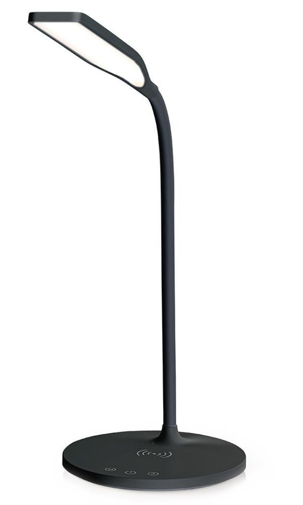 LED stolní lampička s naklápěcí konstrukcí umožňuje nasměrovat světlo přesně tam, kam potřebujete. Pouhým stisknutím tlačítka si můžete zvolit barevnou teplotu od teplé bílé až po studenou. Protiskluzové podložky zajišťují stabilní umístění na stole. Lampička je navíc vybavena bezdrátovou nabíječkou standardu Qi s výkonem 10 W.