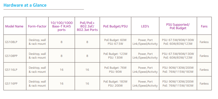 detected. It can further save energy when a short cable is used.PoE+ Support (GS108LP,GS108PP,GS116LP,GS116PP)Power-Over-Ethernet (PoE) and PoE+ options available for powering