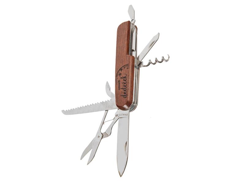 Praktický zavírací nůž s devíti funkcemi z kolekce nejlepší dědeček. Má zdobenou dřevěnou rukojeť a obsahuje: nůž s hladkou čepelí, pilku na dřevo, nůžky, otvírák konzerv, křížový šroubovák, pilník, otvírák lahví se šroubovákem, vývrtku, výstružník a nerezový kroužek pro upevnění na klíče nebo karabinku.